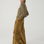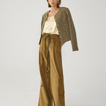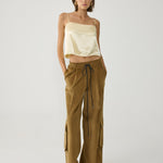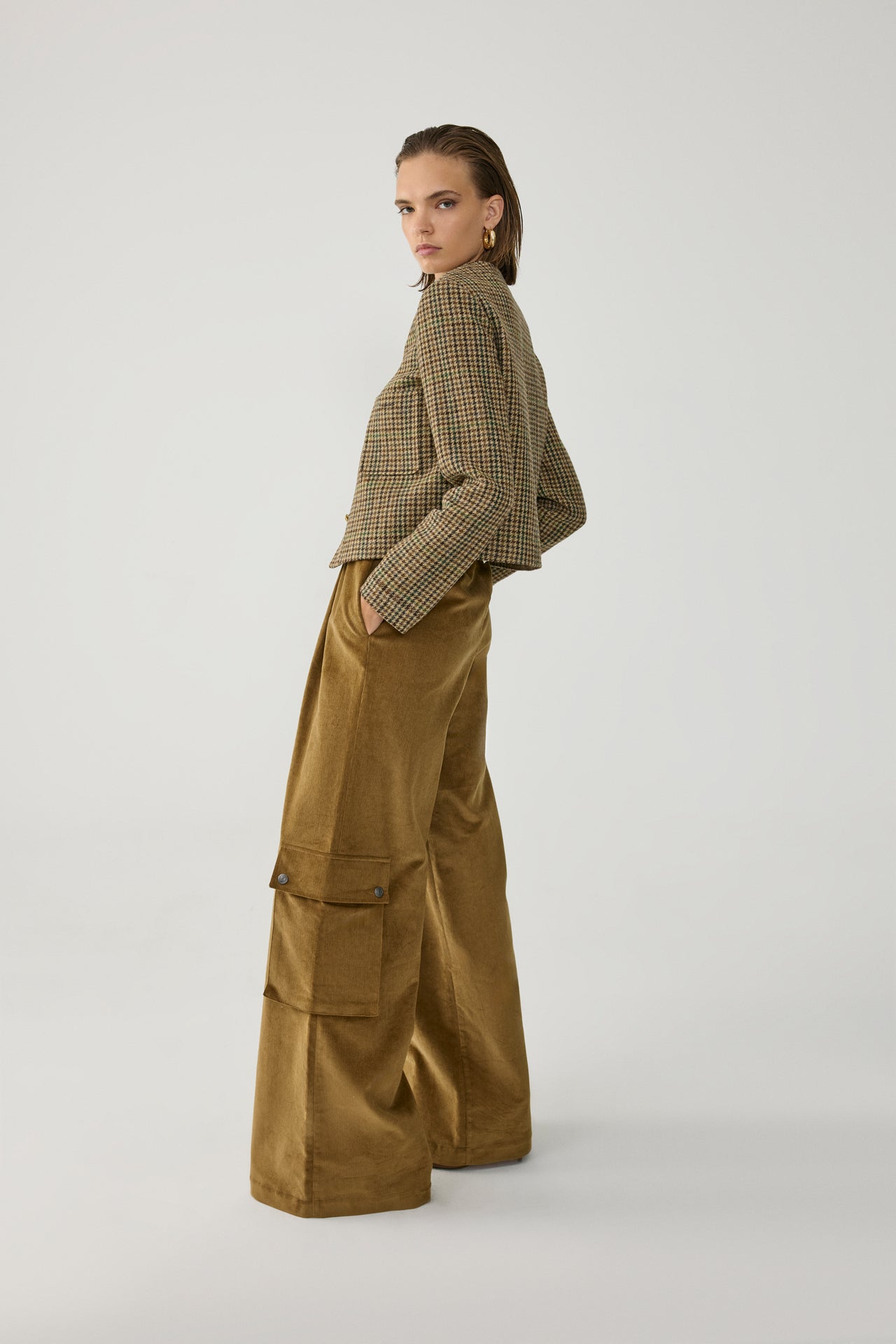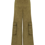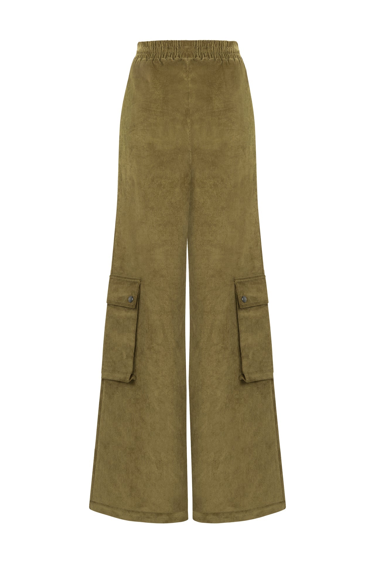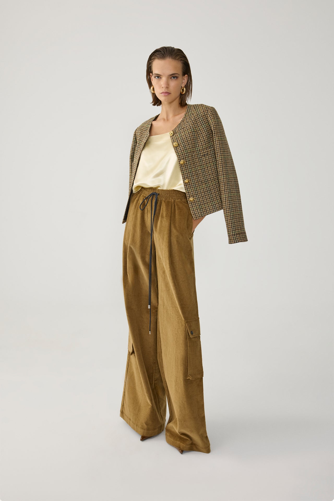 Wide-leg trousers made of velvet fabric with a drawstring waist and pocket details.