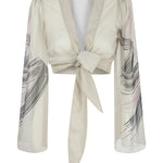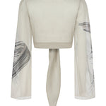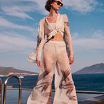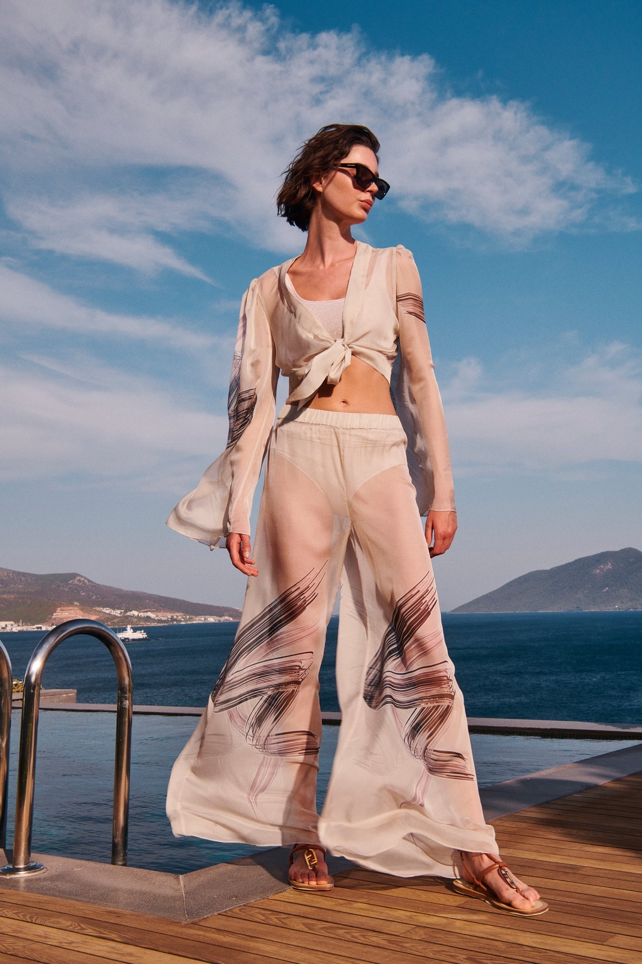 Deep-necked see-through shirt with a bow tie at the front. The sleeves are long Spanish cut. Shoulder tops are shirred. You can complete the look with Alix Pants. Suitable for beach wear.