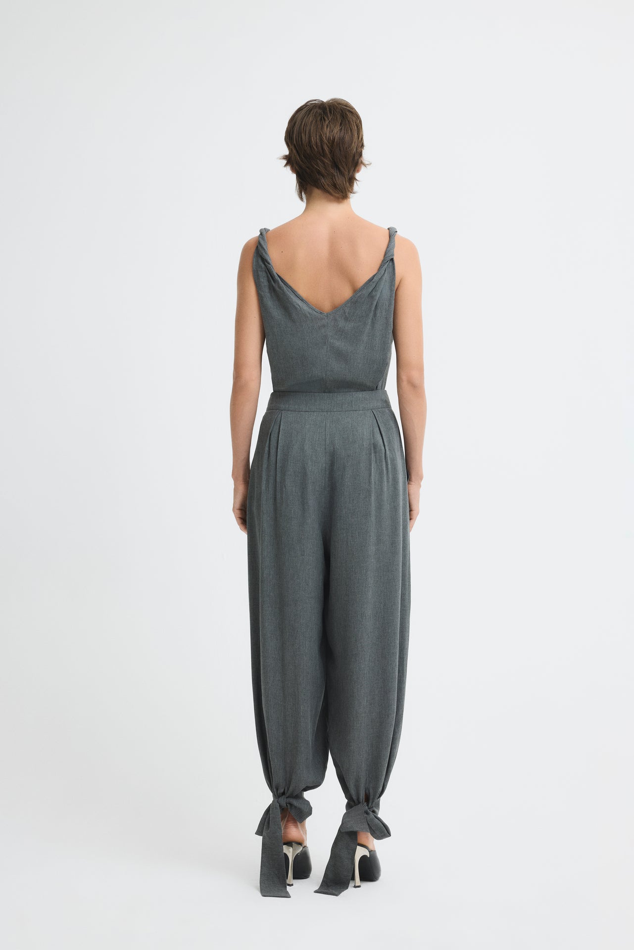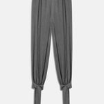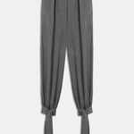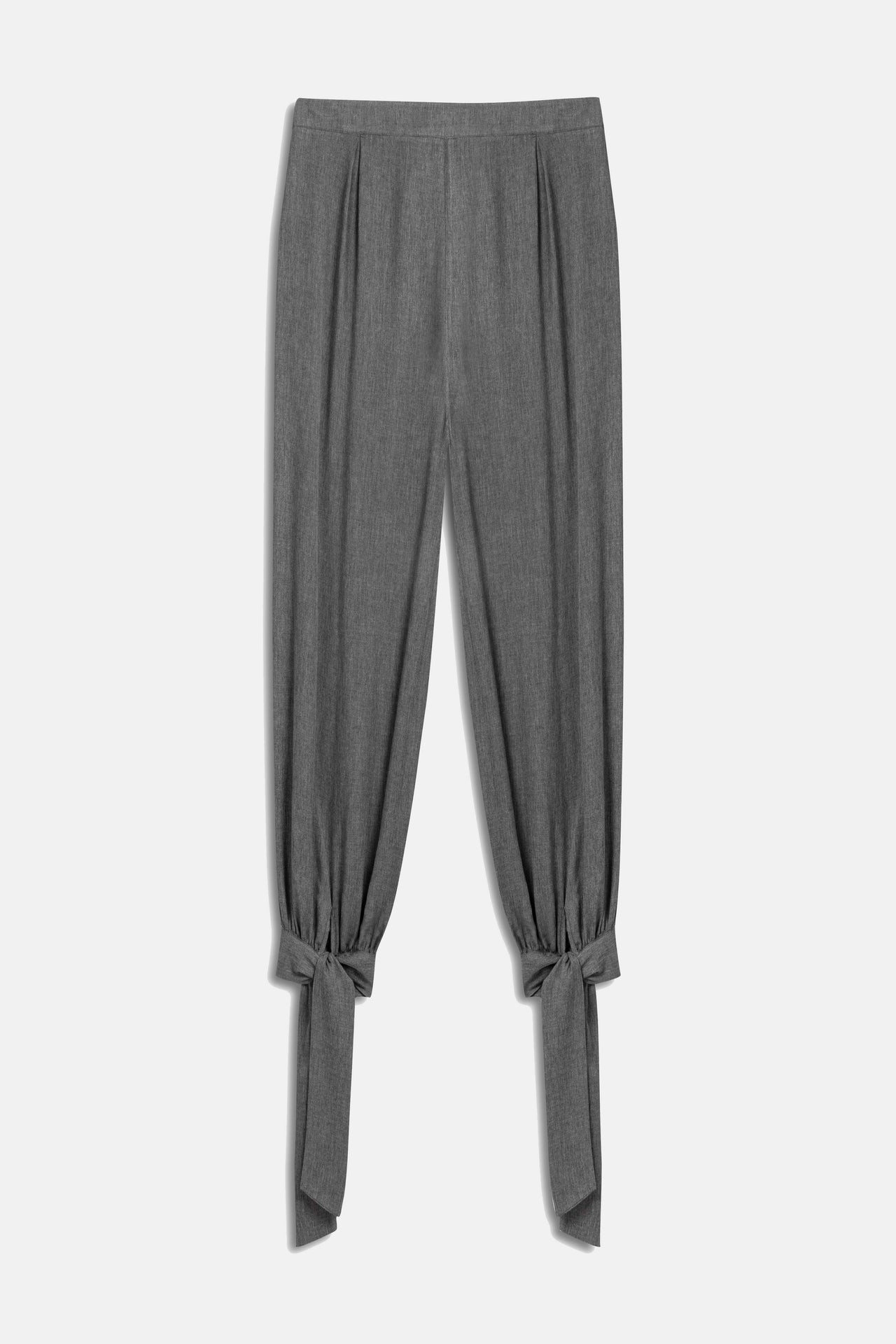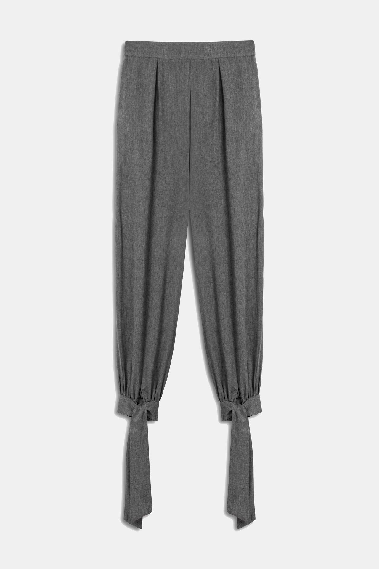 High-waisted, pleated wide-leg pants with tie-up ankles.