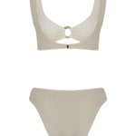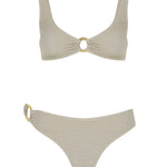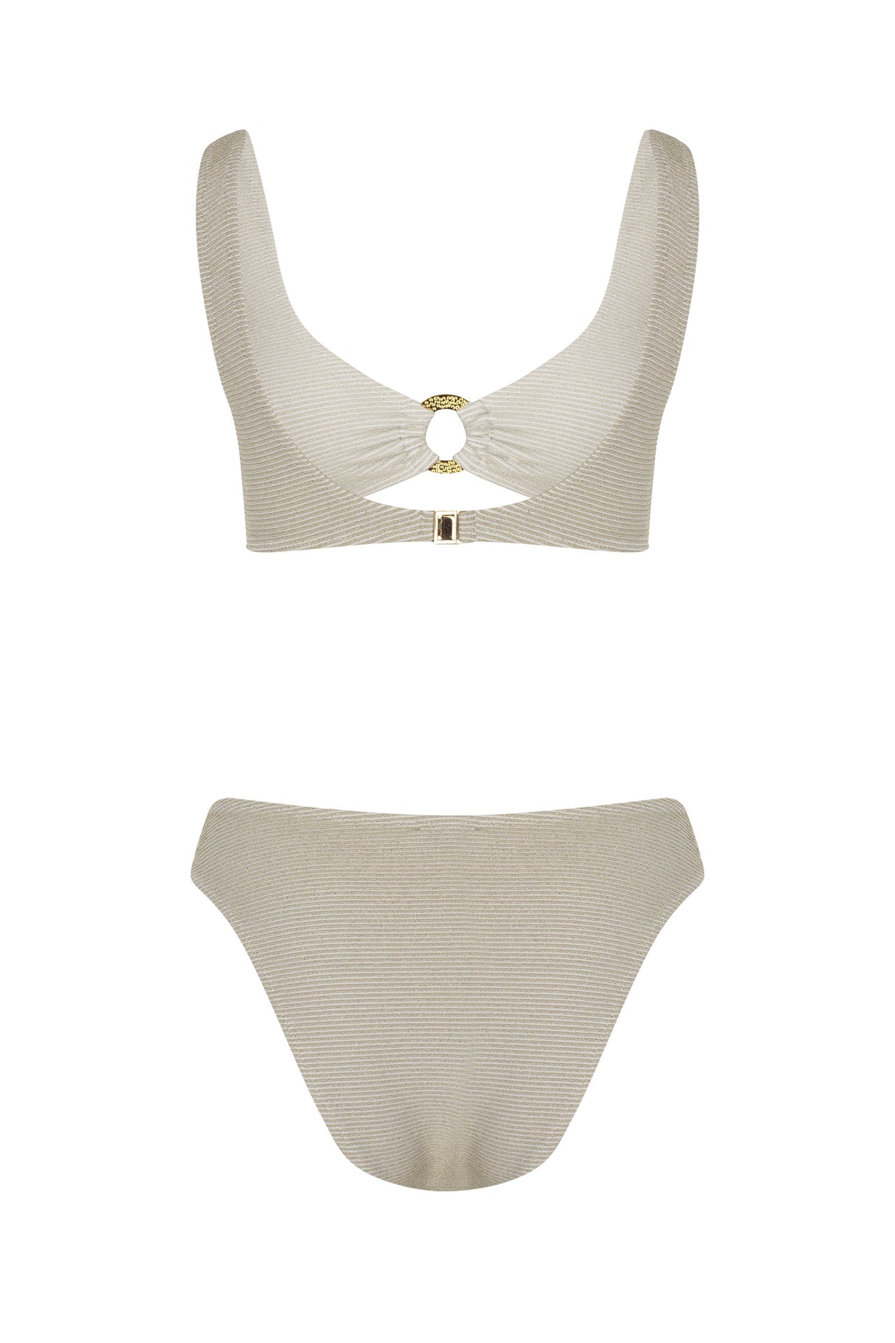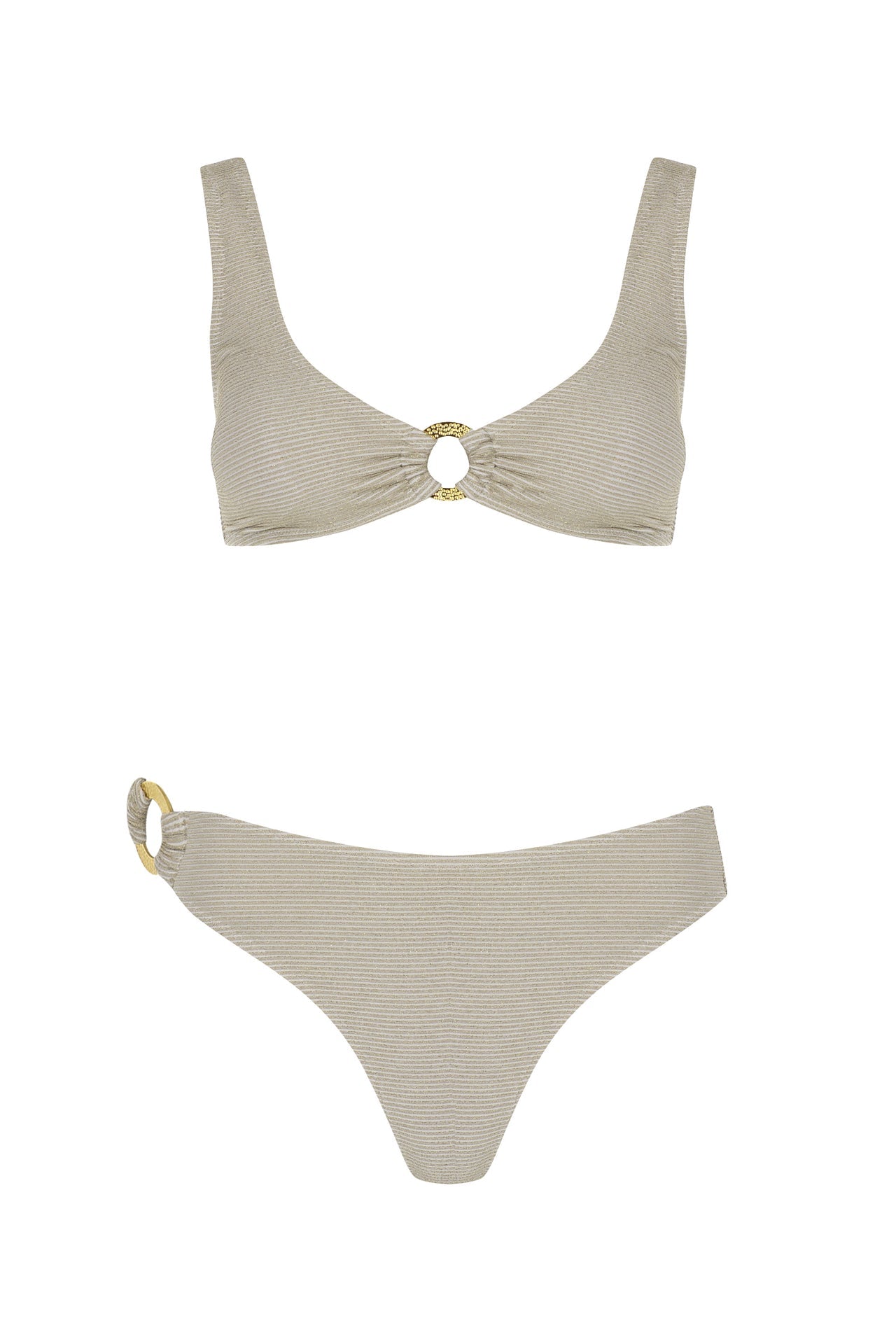Set consisting of a bikini top with thick shoulder straps and a bikini bottom with metal accessories on the side.