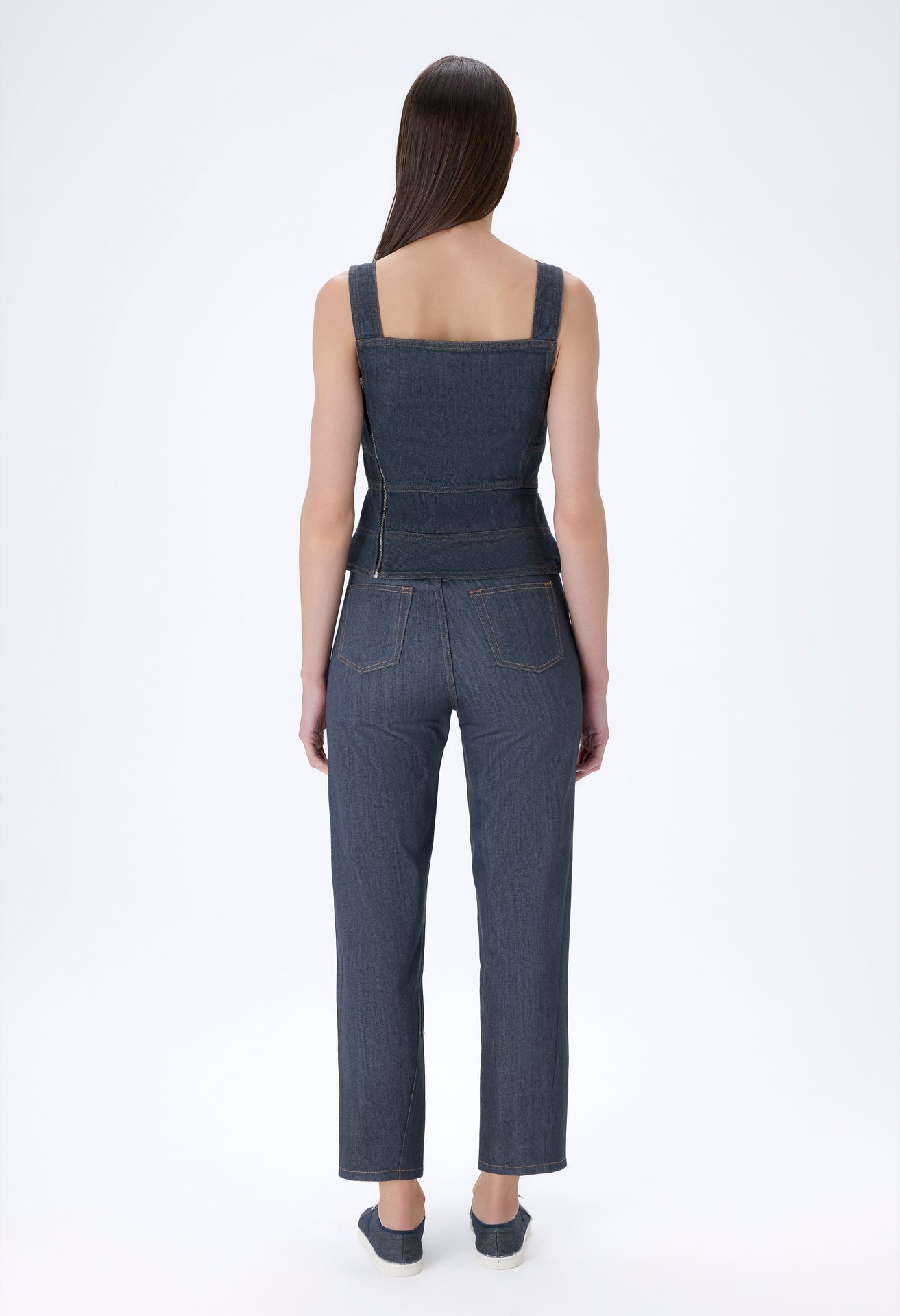 Cross-stitched tapered-leg jeans.