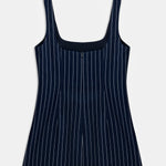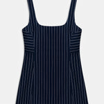 Square neck mini dress with thick straps and pinstripe pattern.