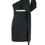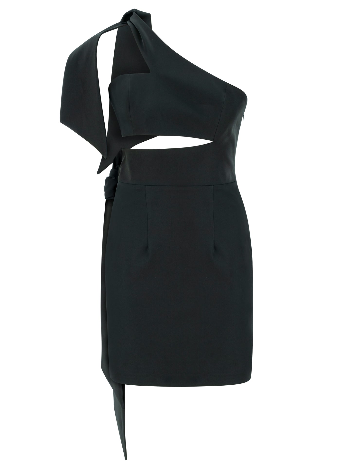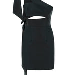 One-shoulder mini designer dress. The dress is dark green in color with one shoulder and lace detail at the waist.