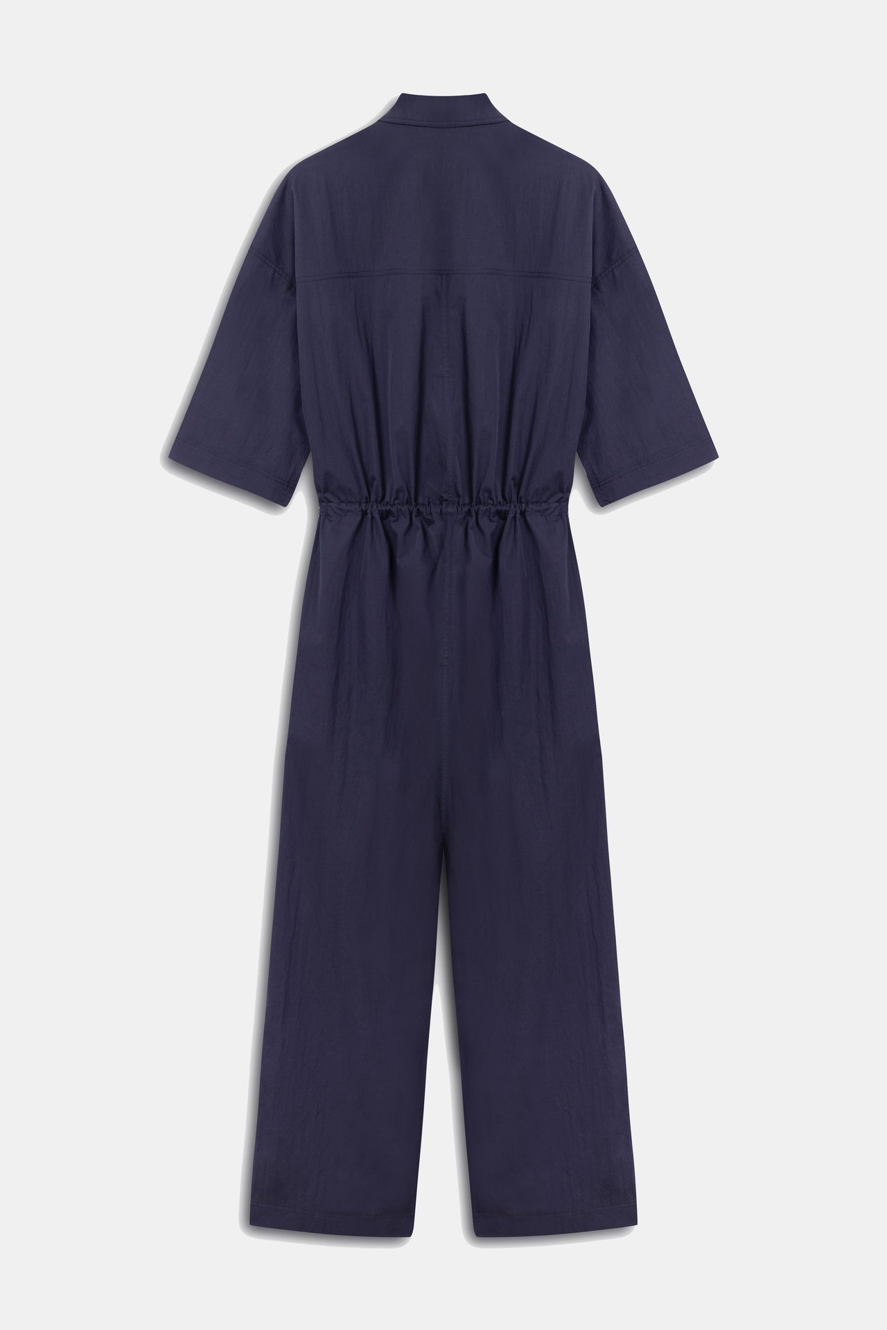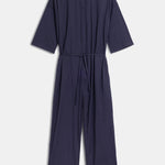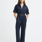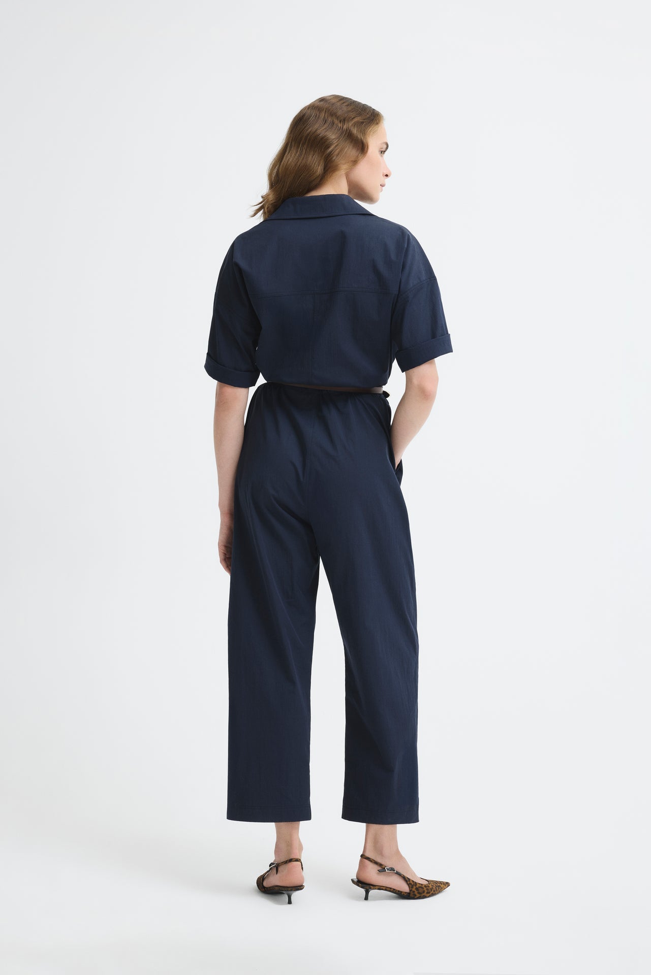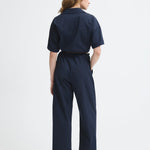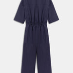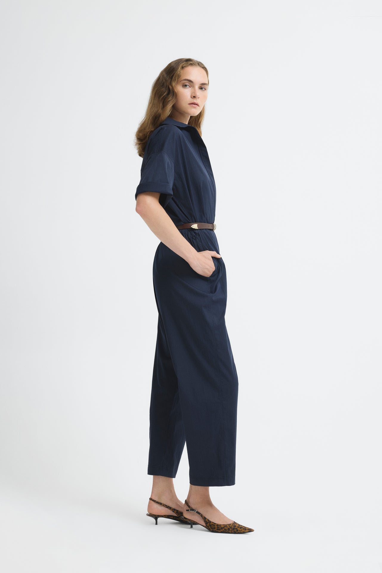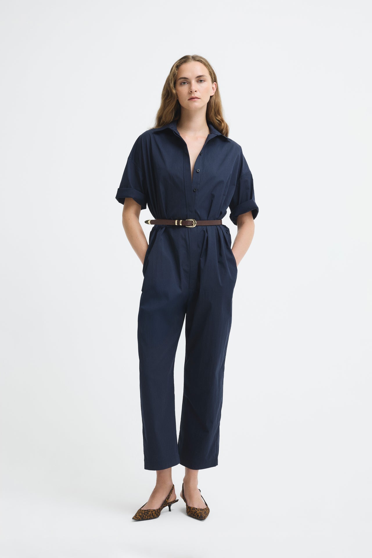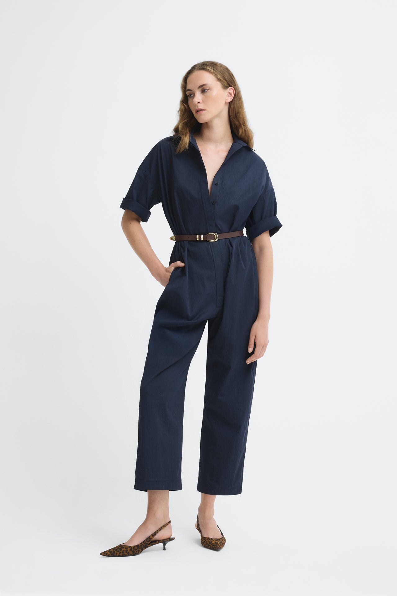 Short-sleeved, collared cotton jumpsuit with button closure and straight-leg trousers.