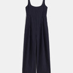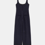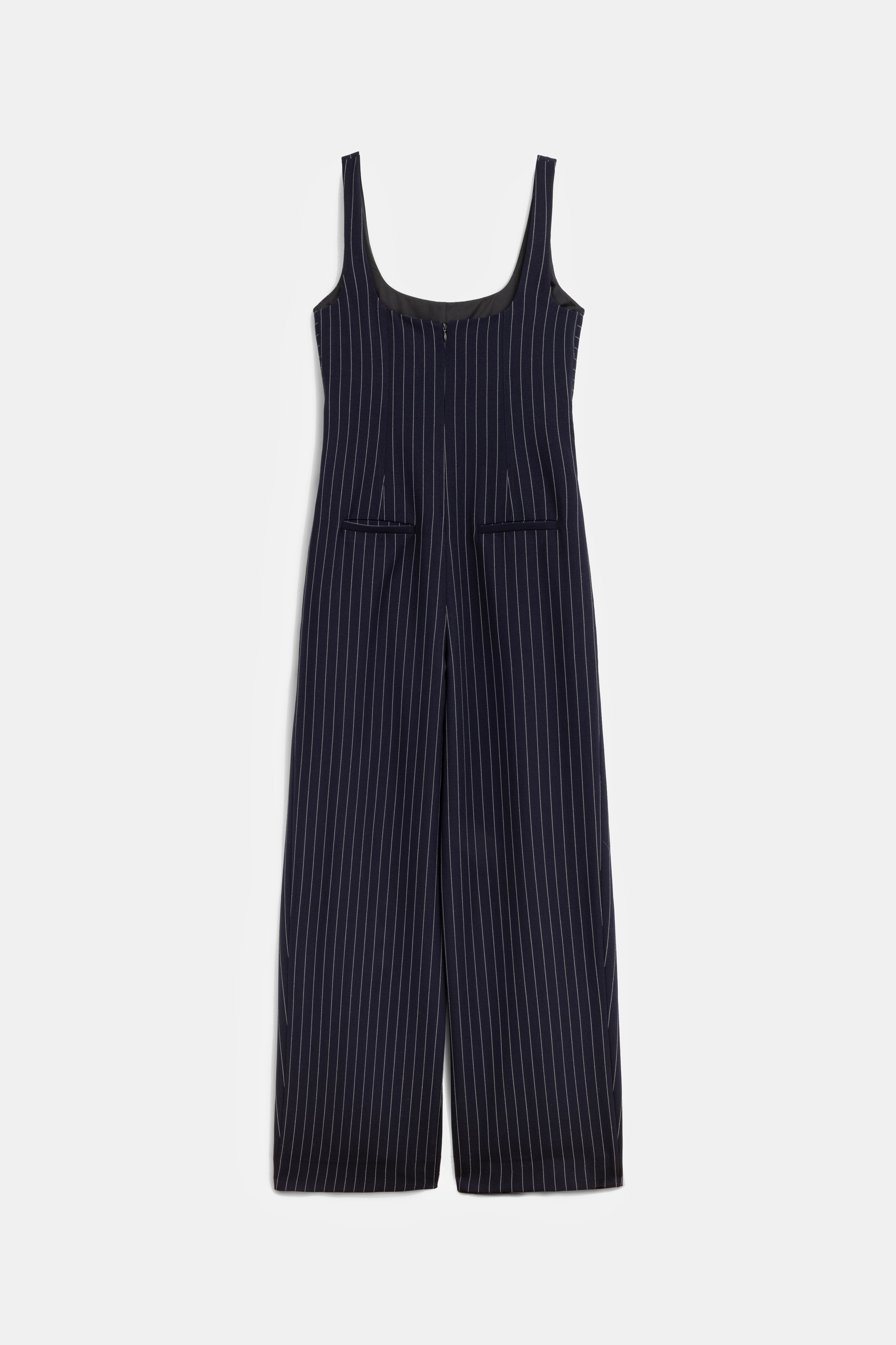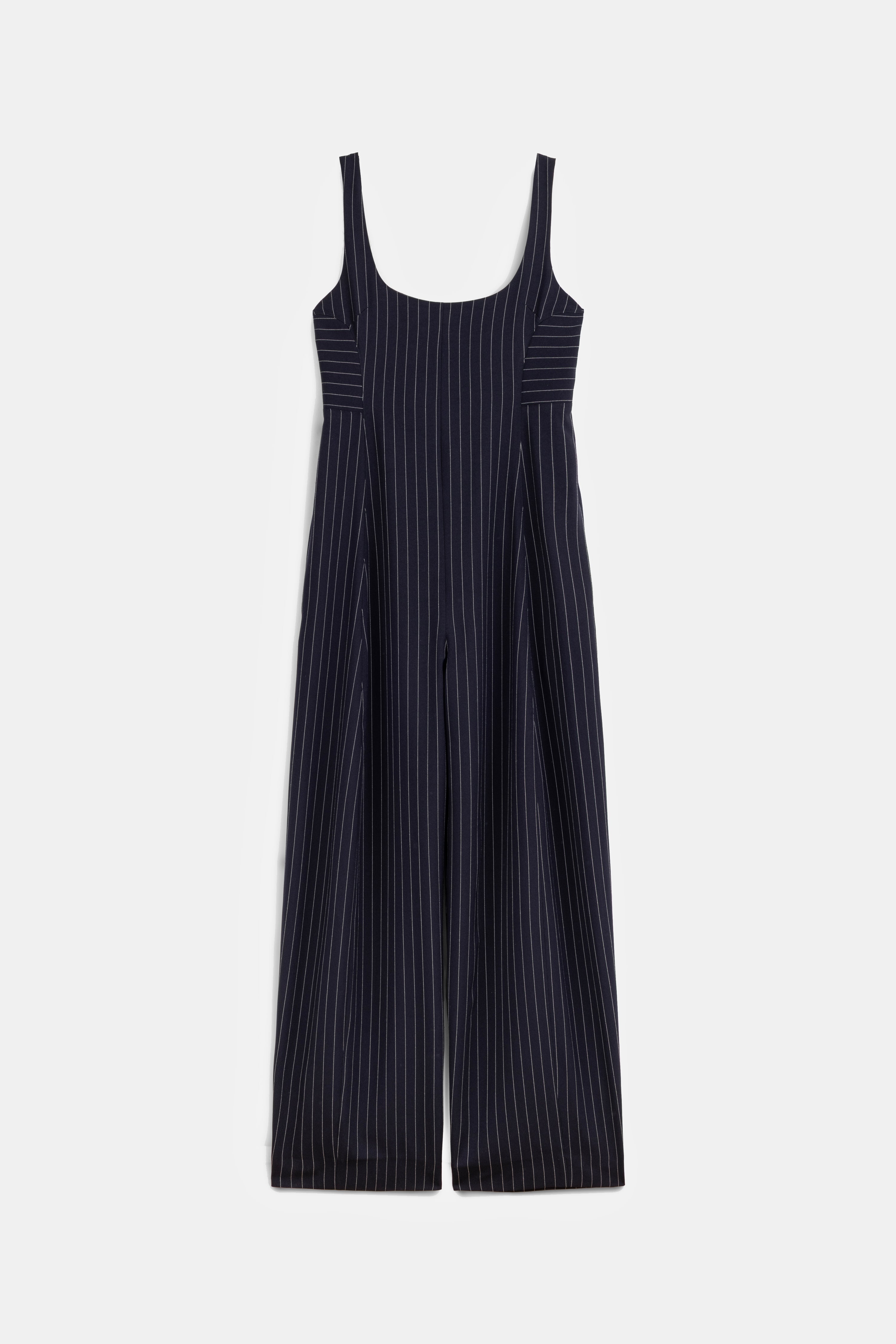 A wide-leg jumpsuit with straps and pinstripe pattern.