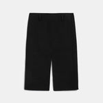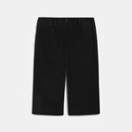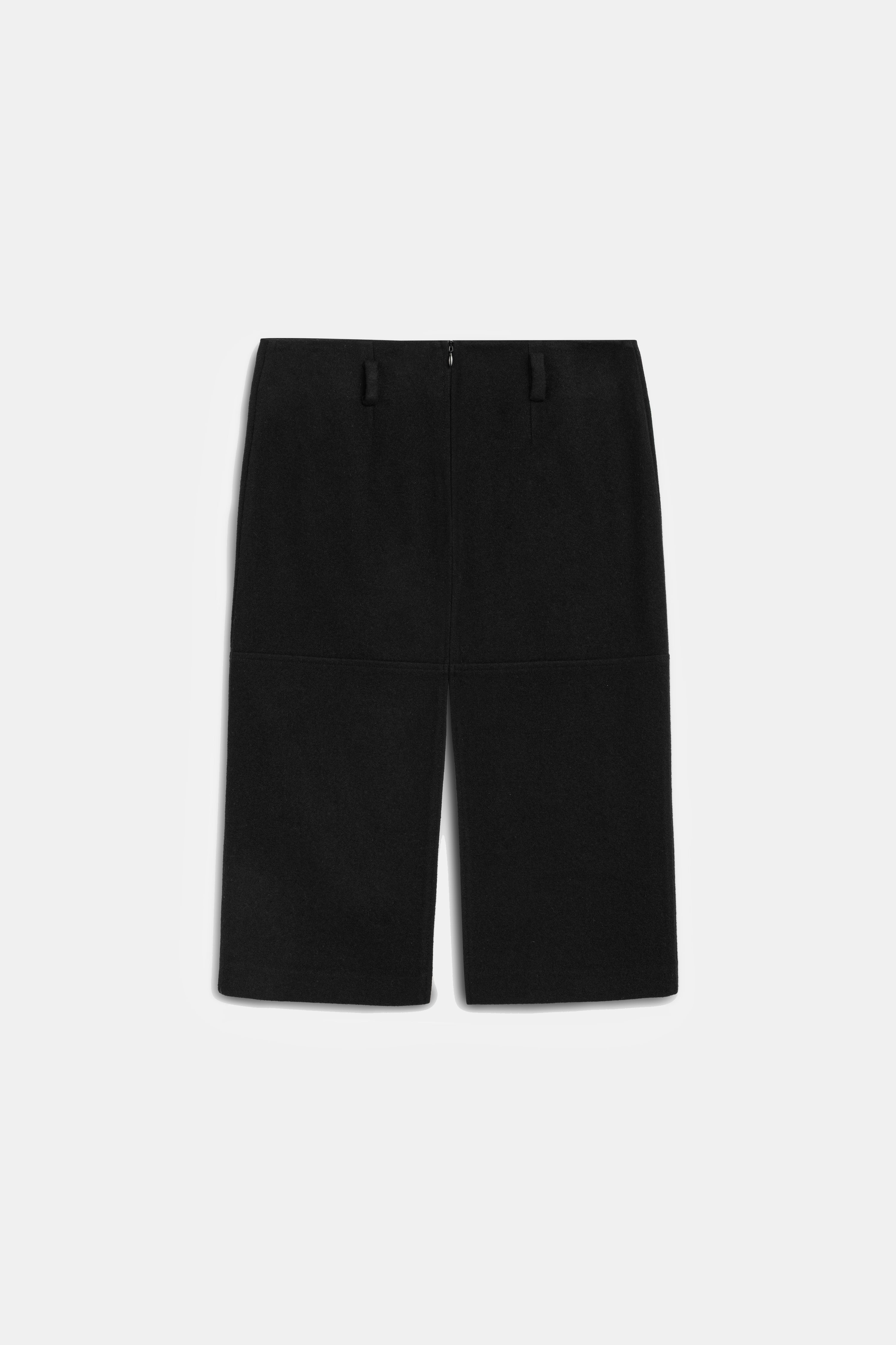 High-waisted, midi-length black skirt with front and back slits.