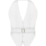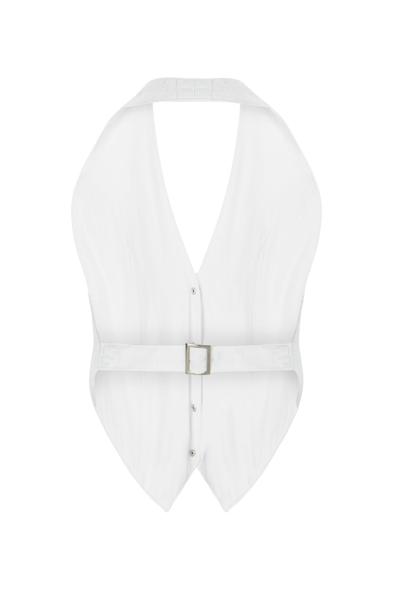 The vest is closed with a button in the front and has a form that hugs the body. You can adjust the waist size from the back belt.