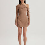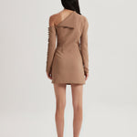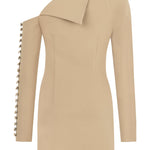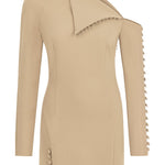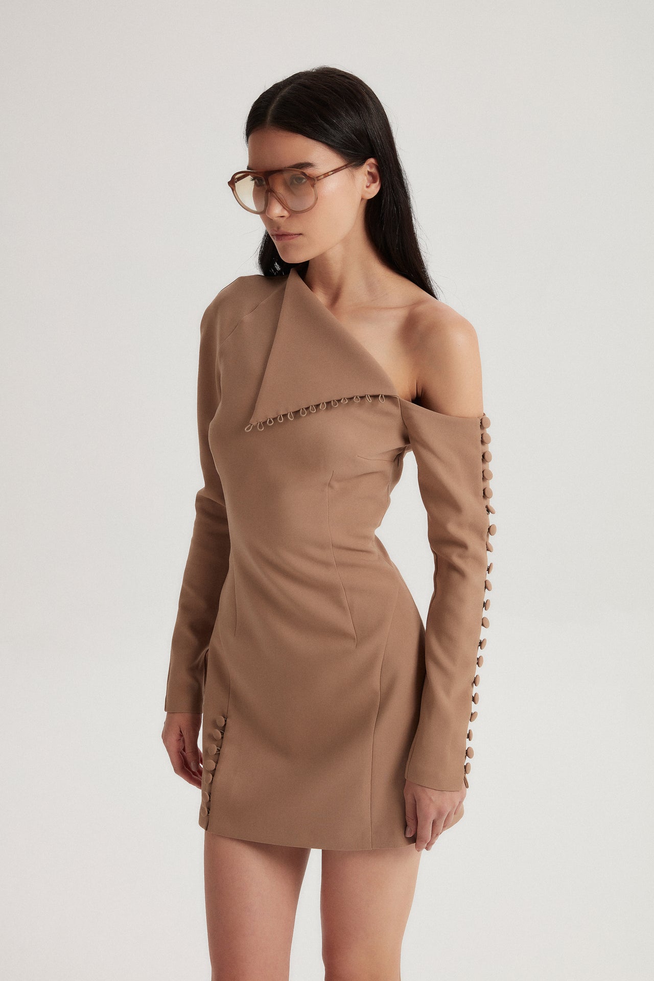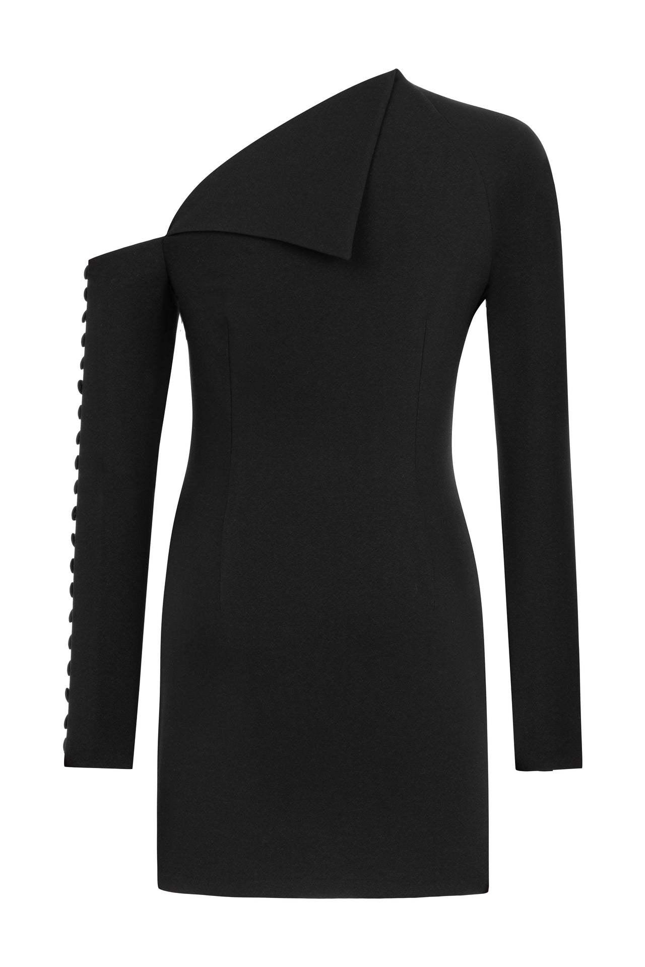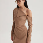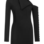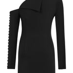 Asymmetric one-shoulder, long-sleeve mini dress with button details.