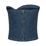 Denim bustier with asymmetrical chest detail and body-hugging design. It is closed at the back with a zipper.