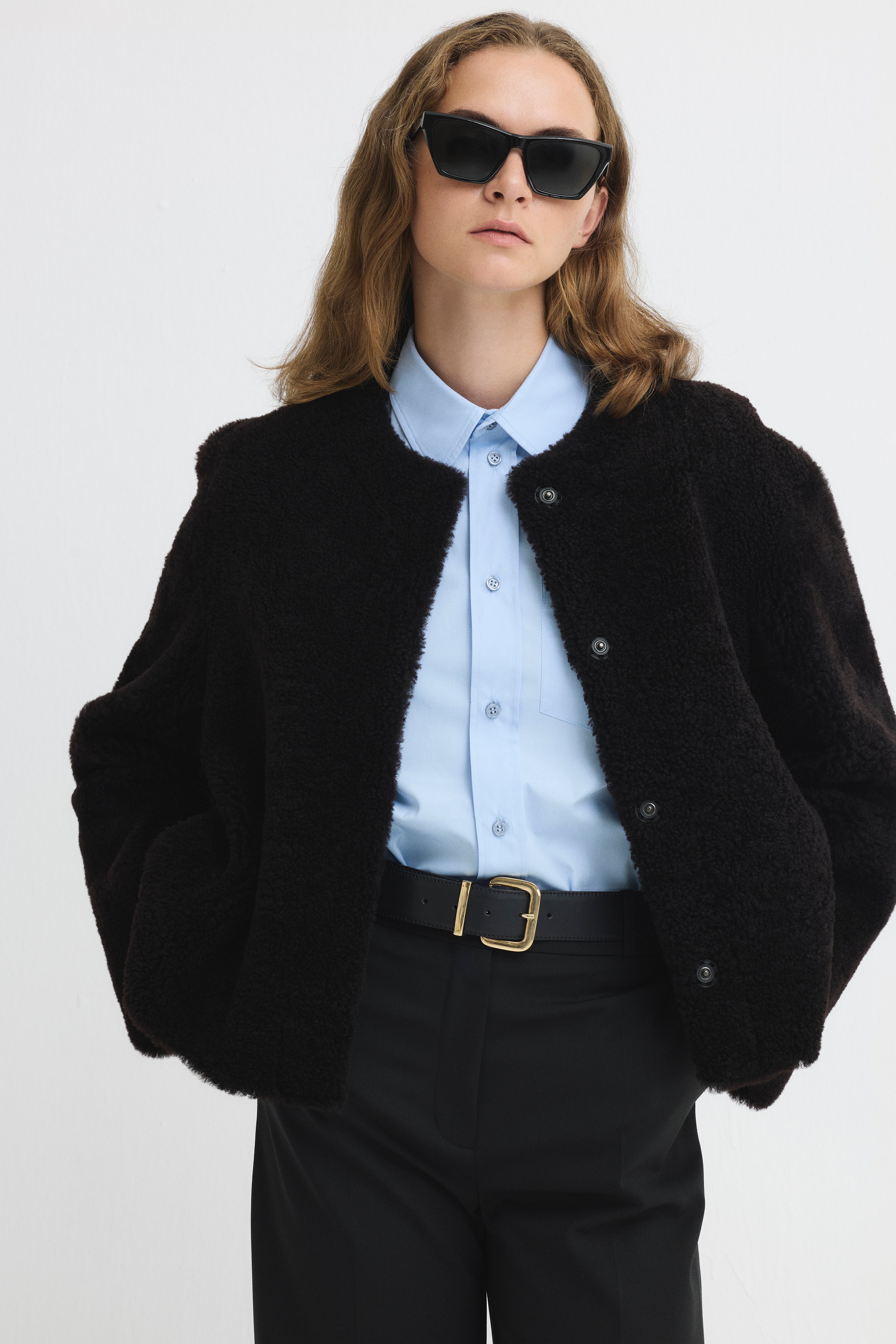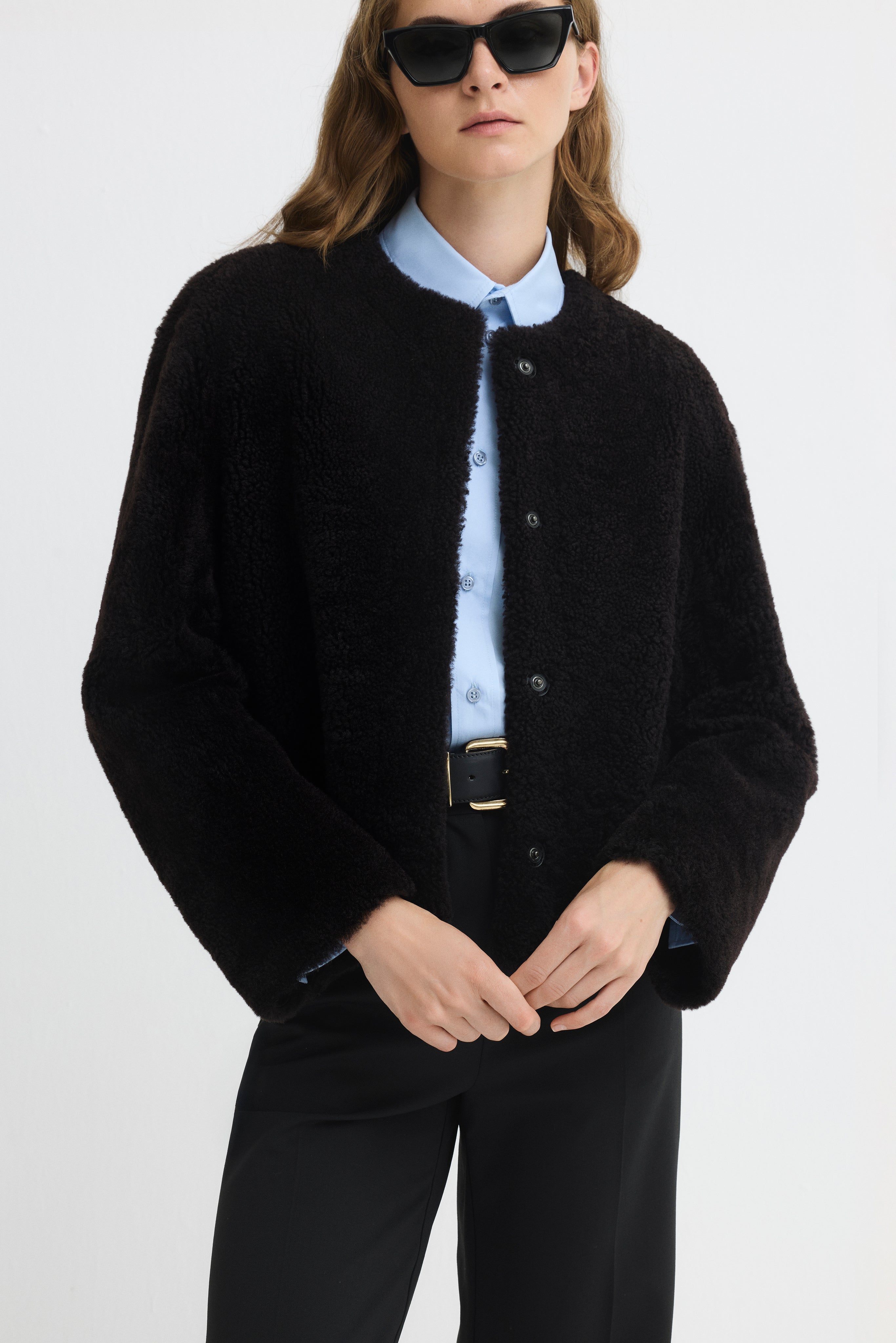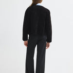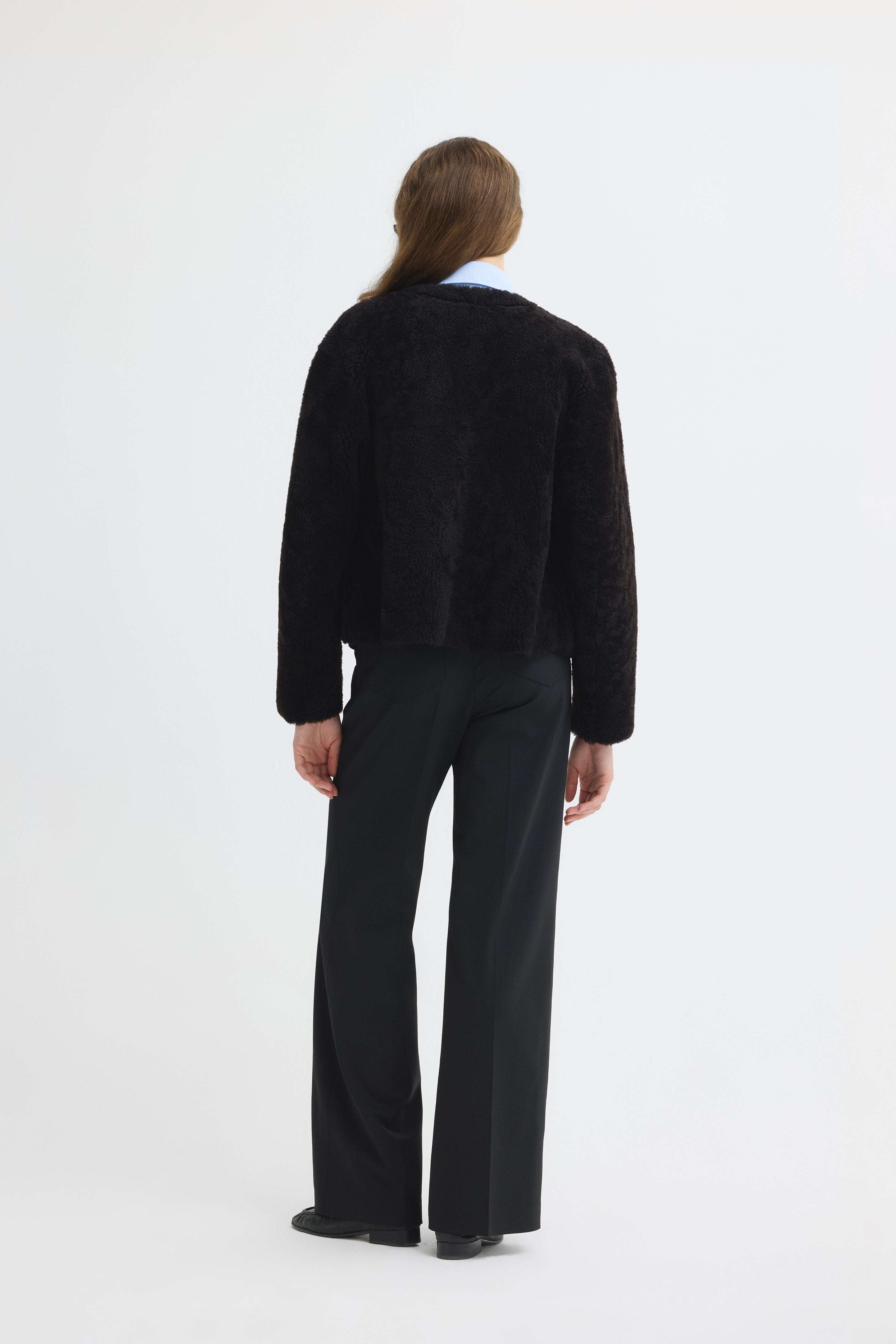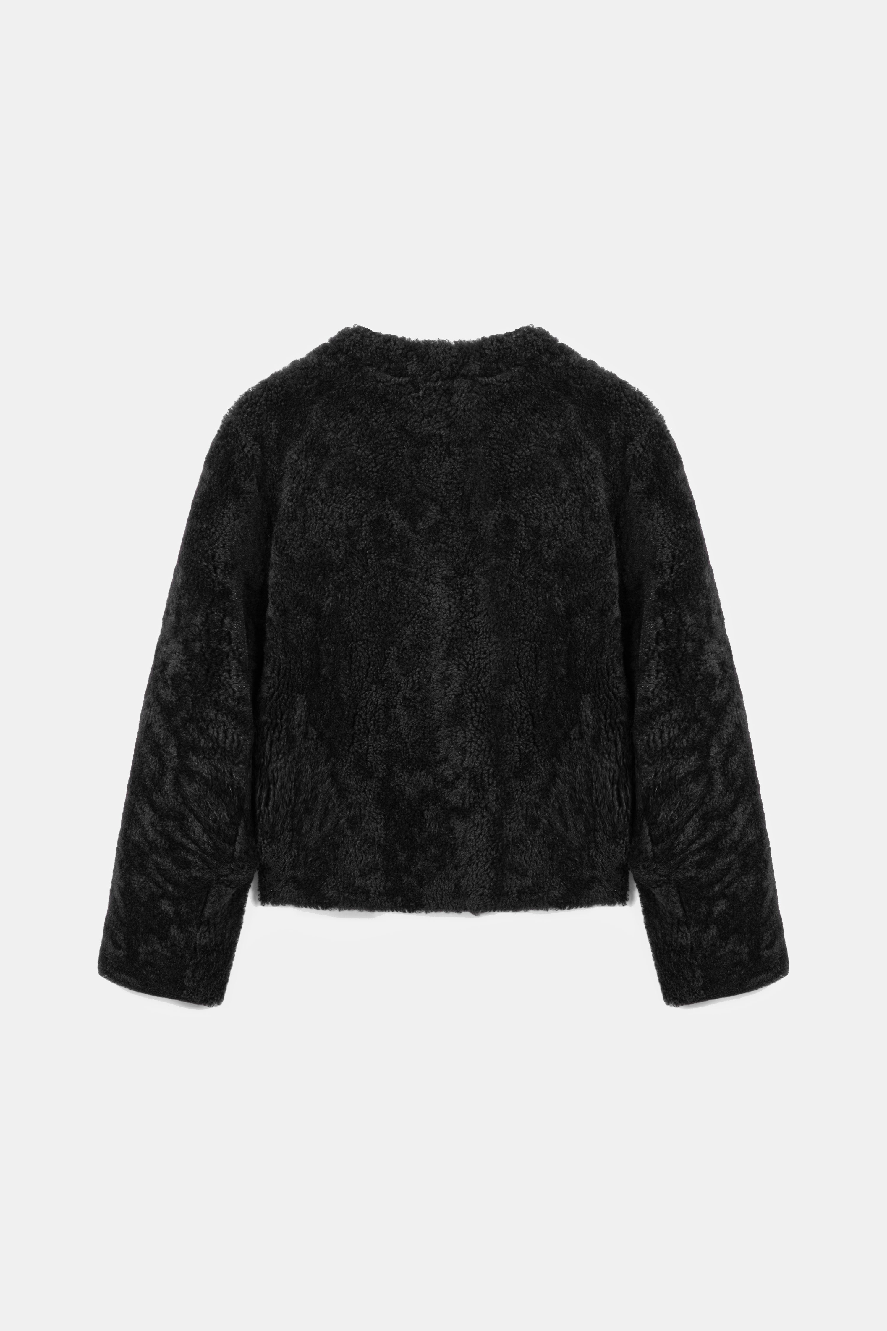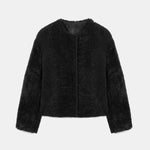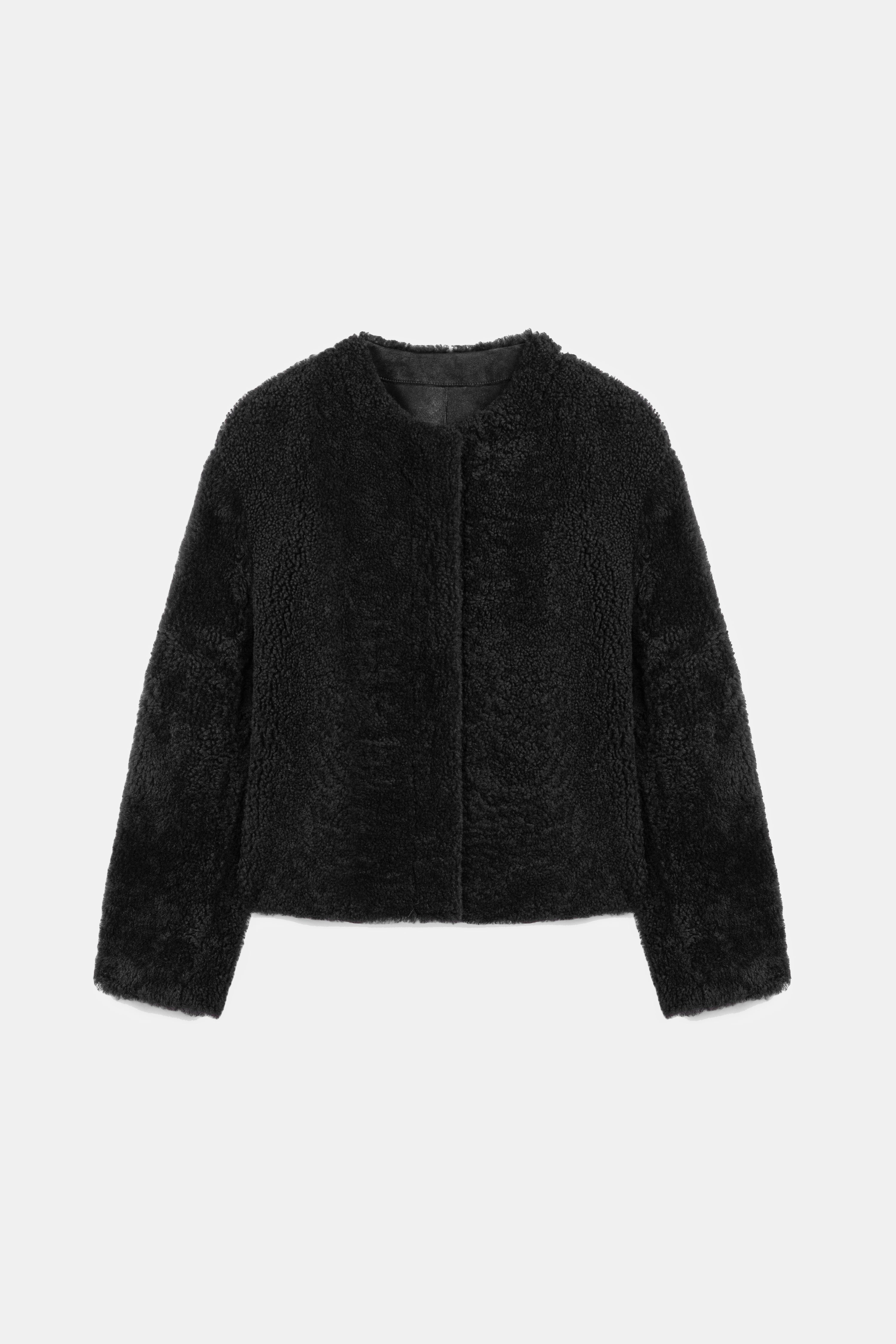 Short, round-neck textured fur jacket.