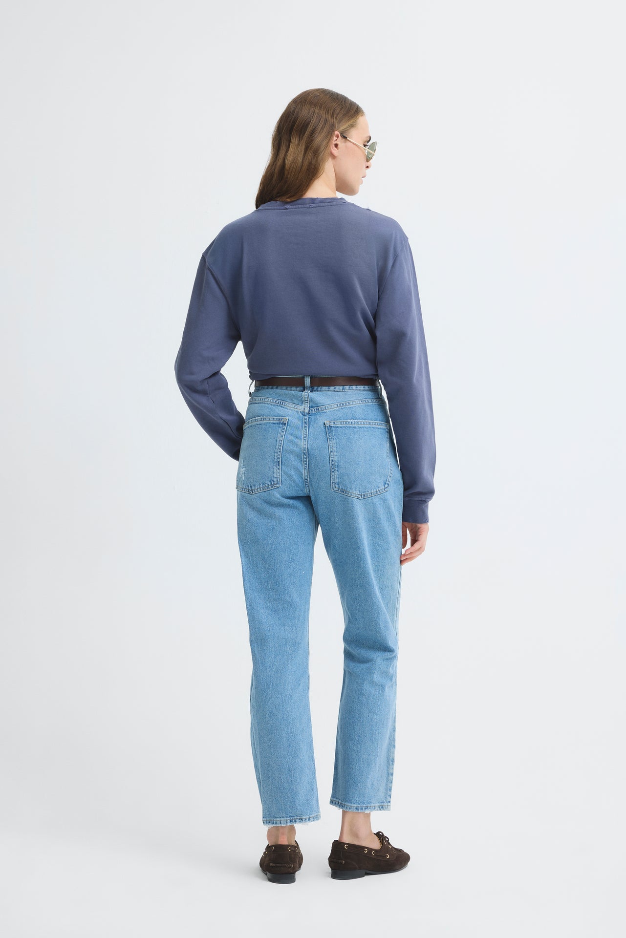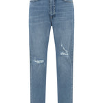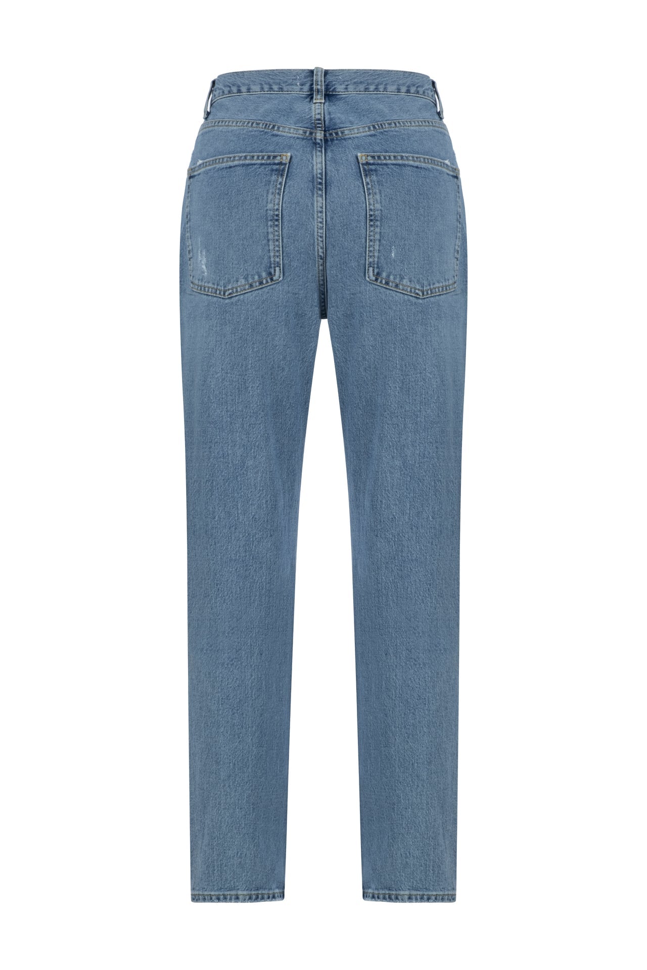 Worn, mid-waist high tube-leg pants. It has pockets and 5 bridge details on the waistband.