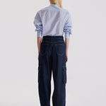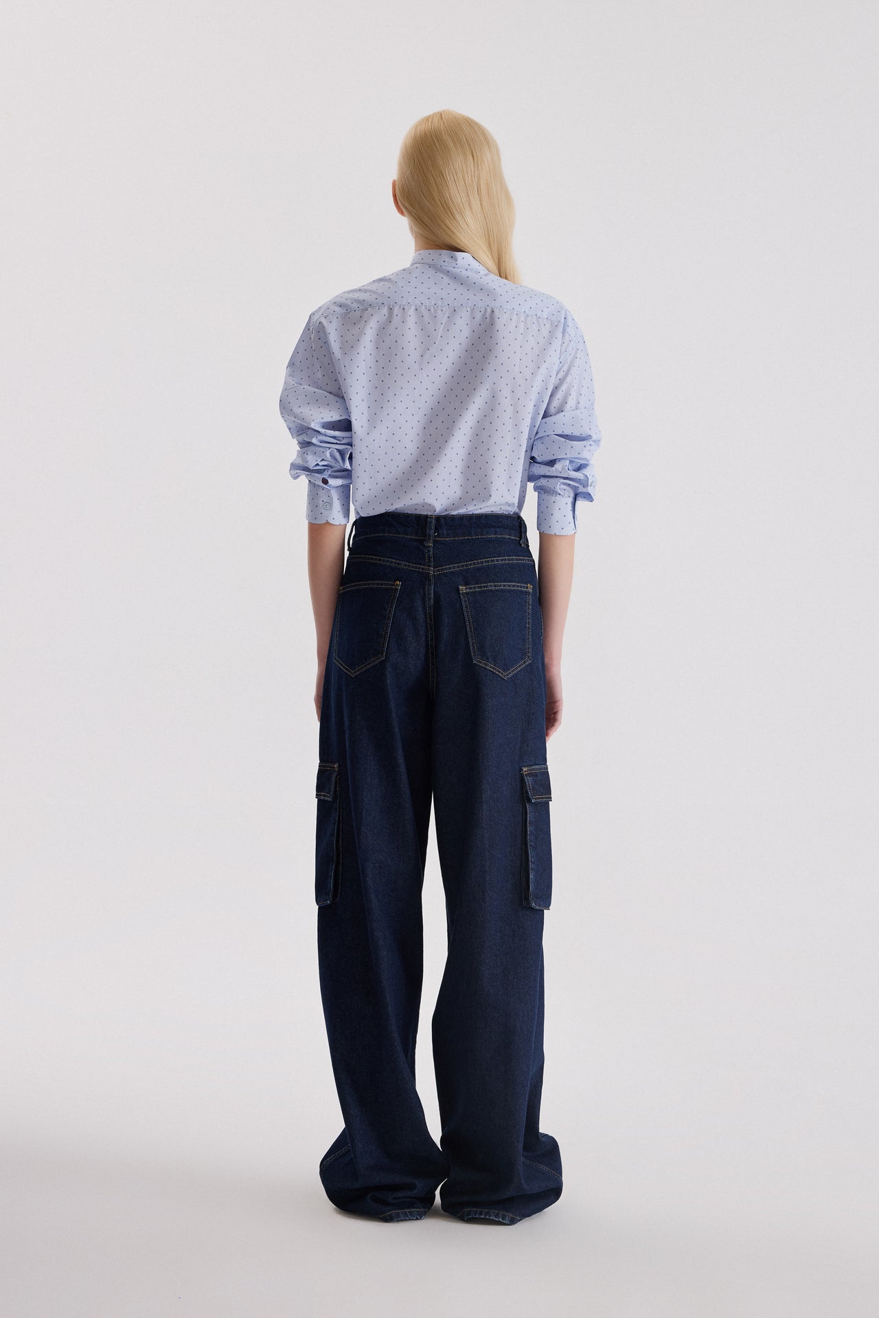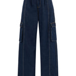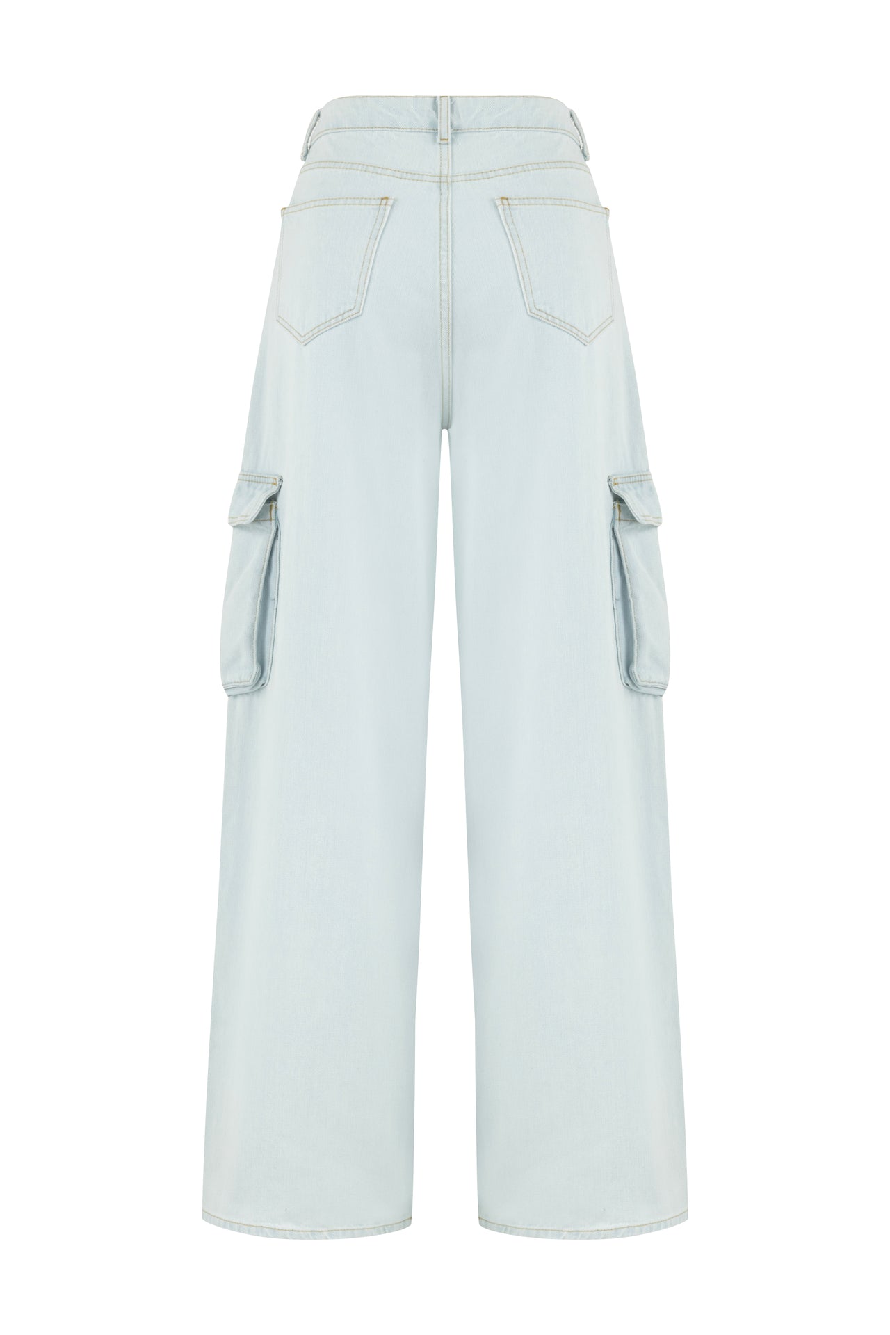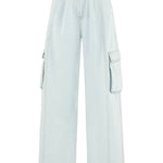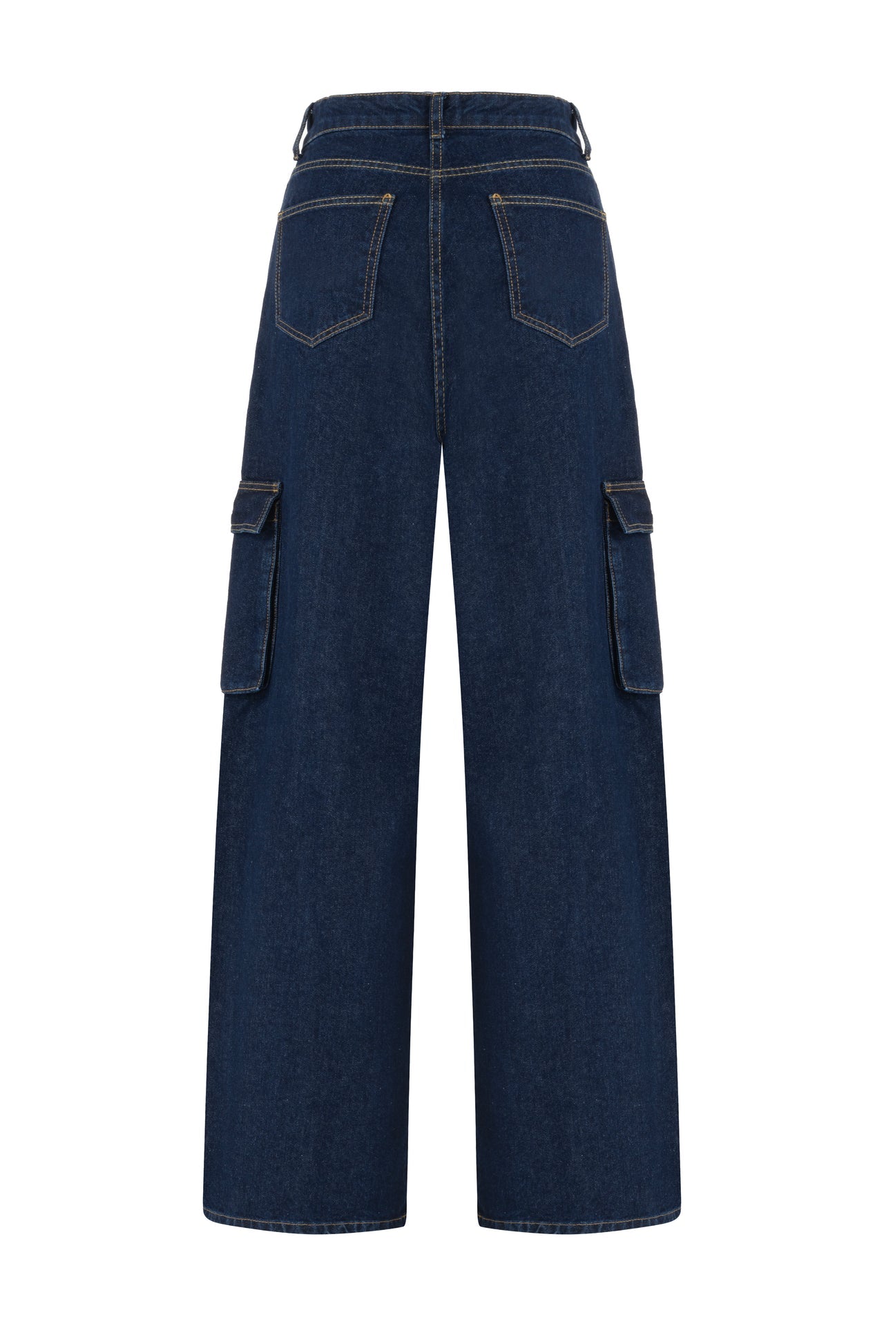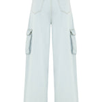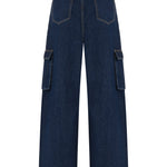 High-waisted wide-leg denim pants with cargo pockets and pleat details.