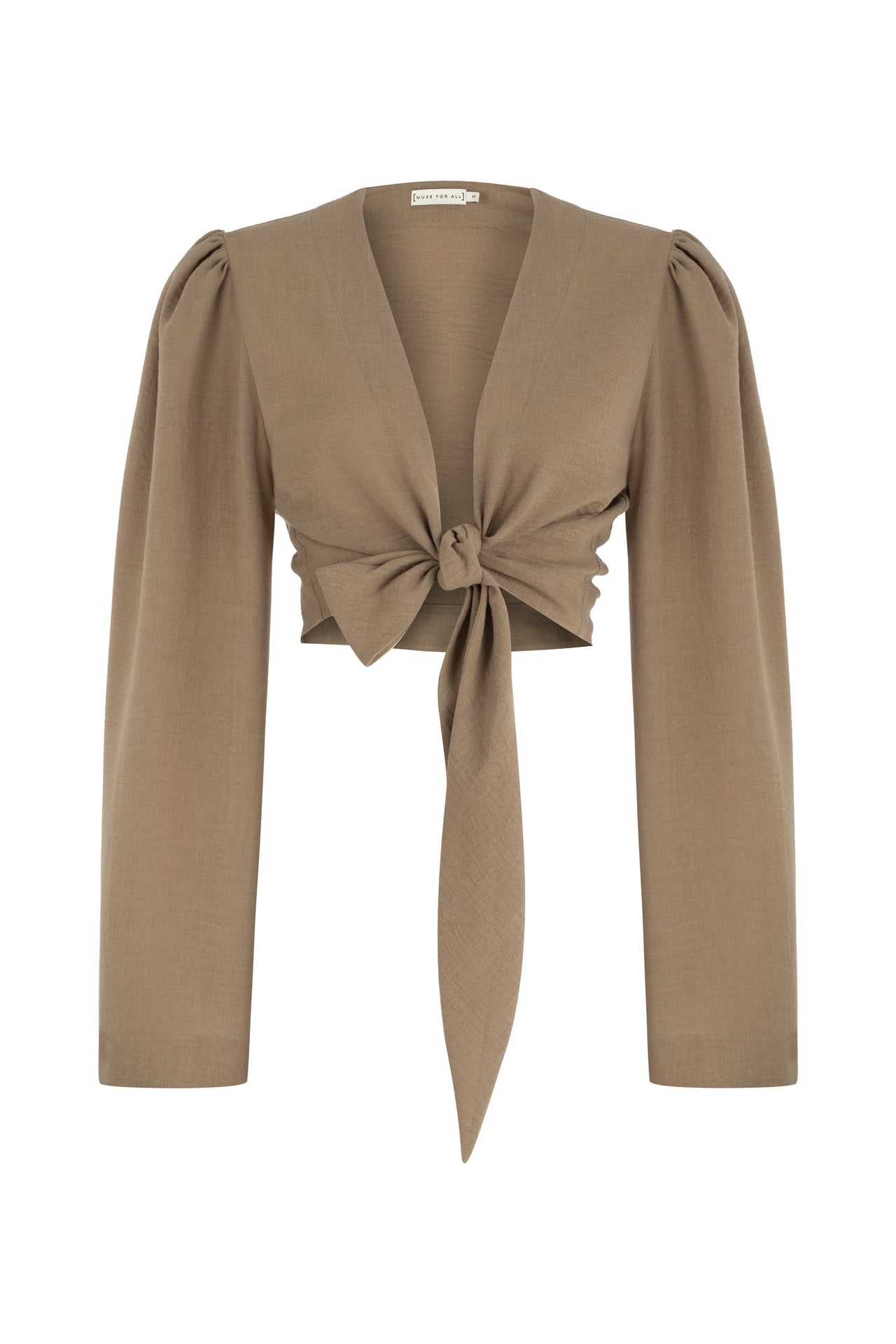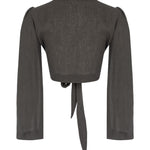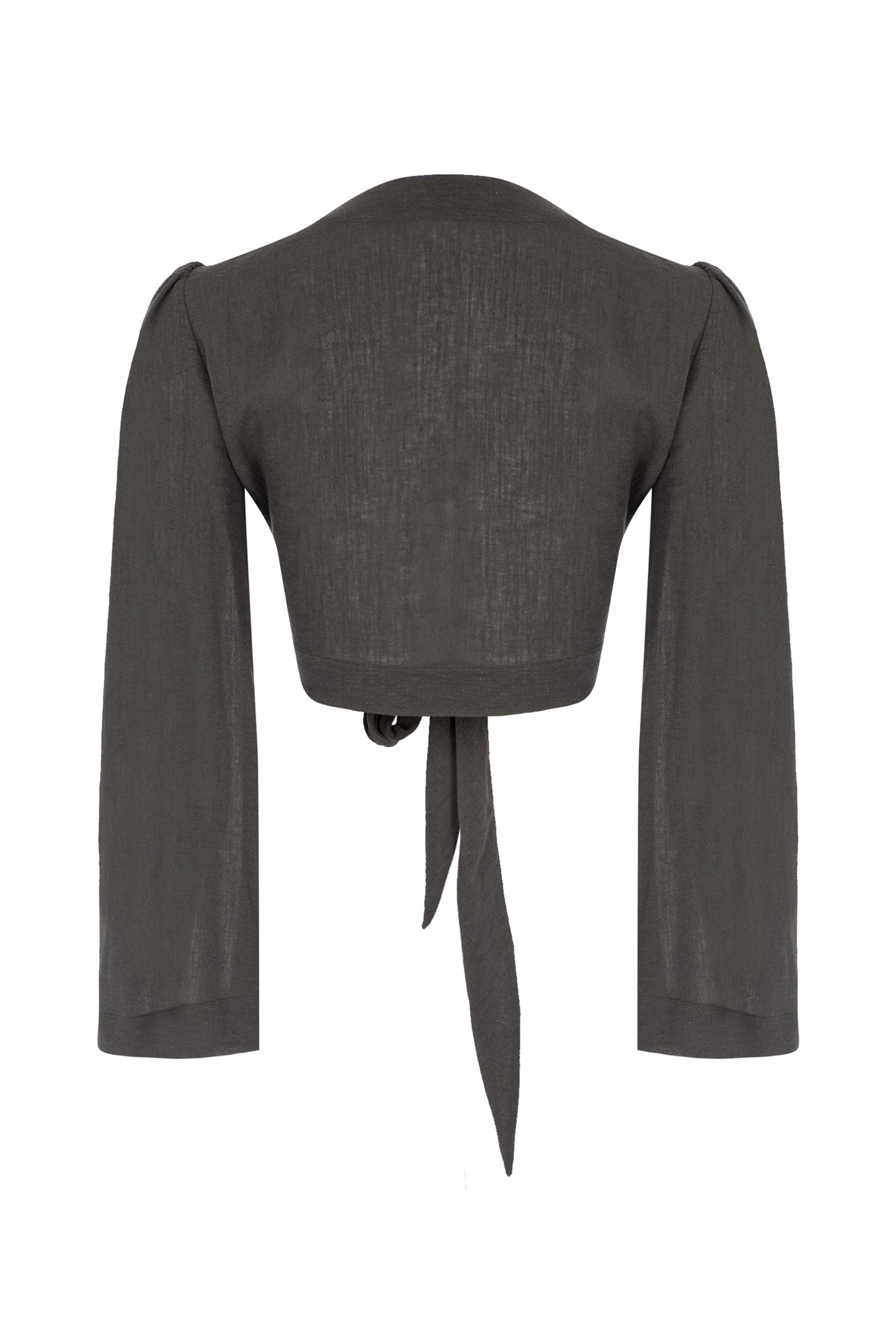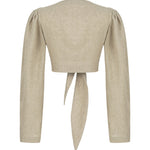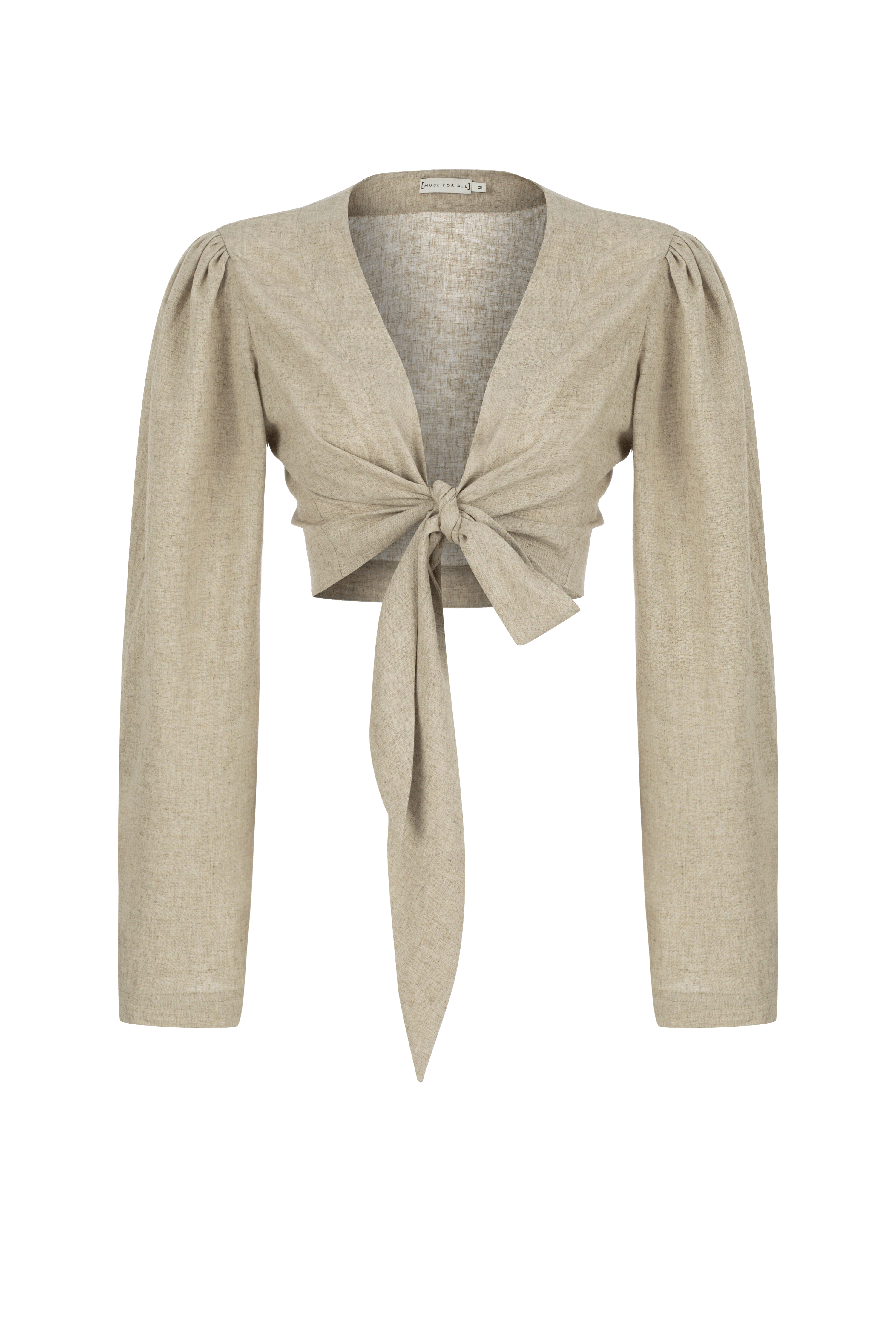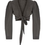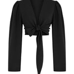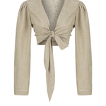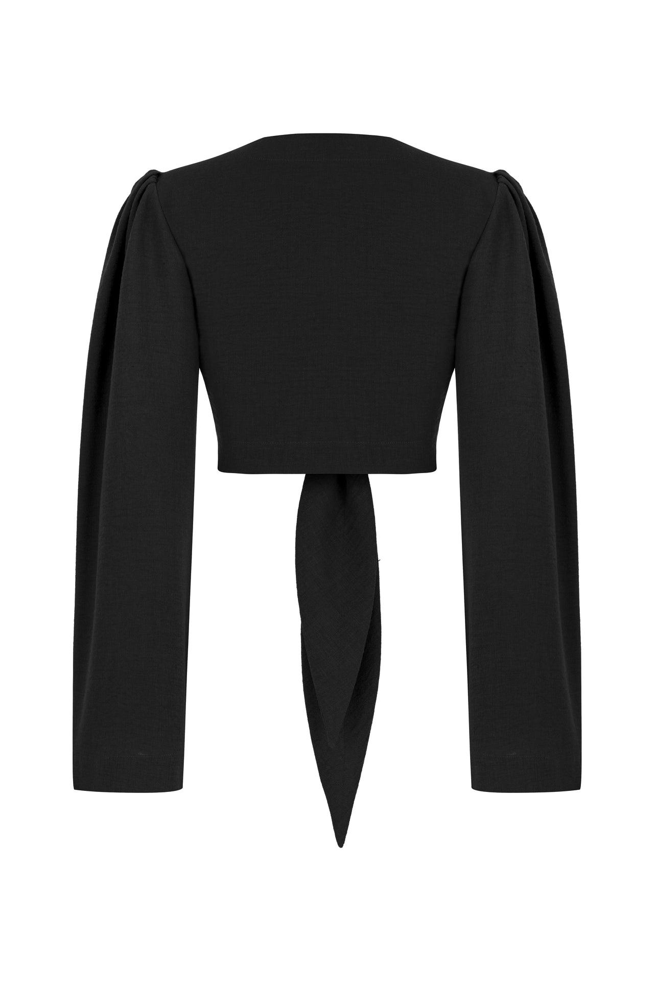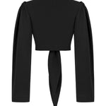 Deep-necked see-through shirt with a bow tie at the front. The sleeves are long Spanish cut. Shoulder tops are shirred. You can complete the look with Lylie Pants.