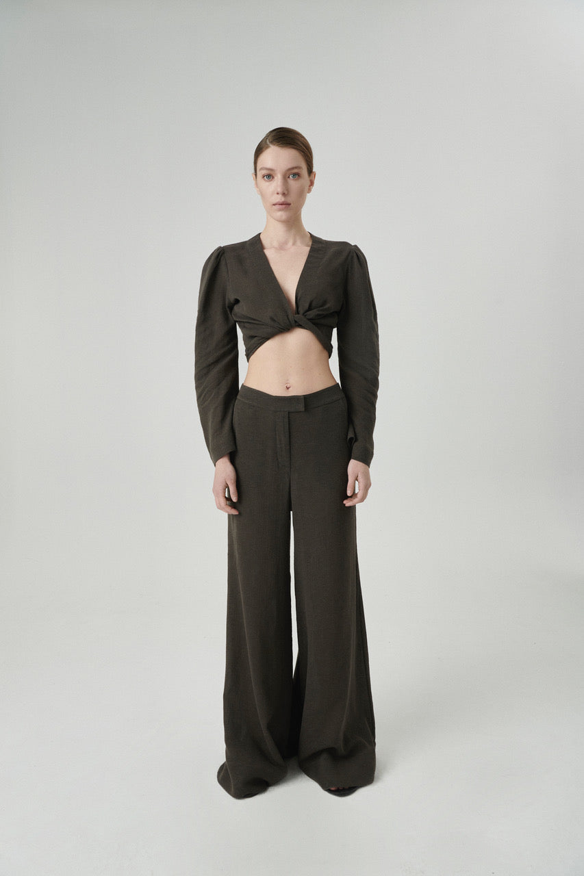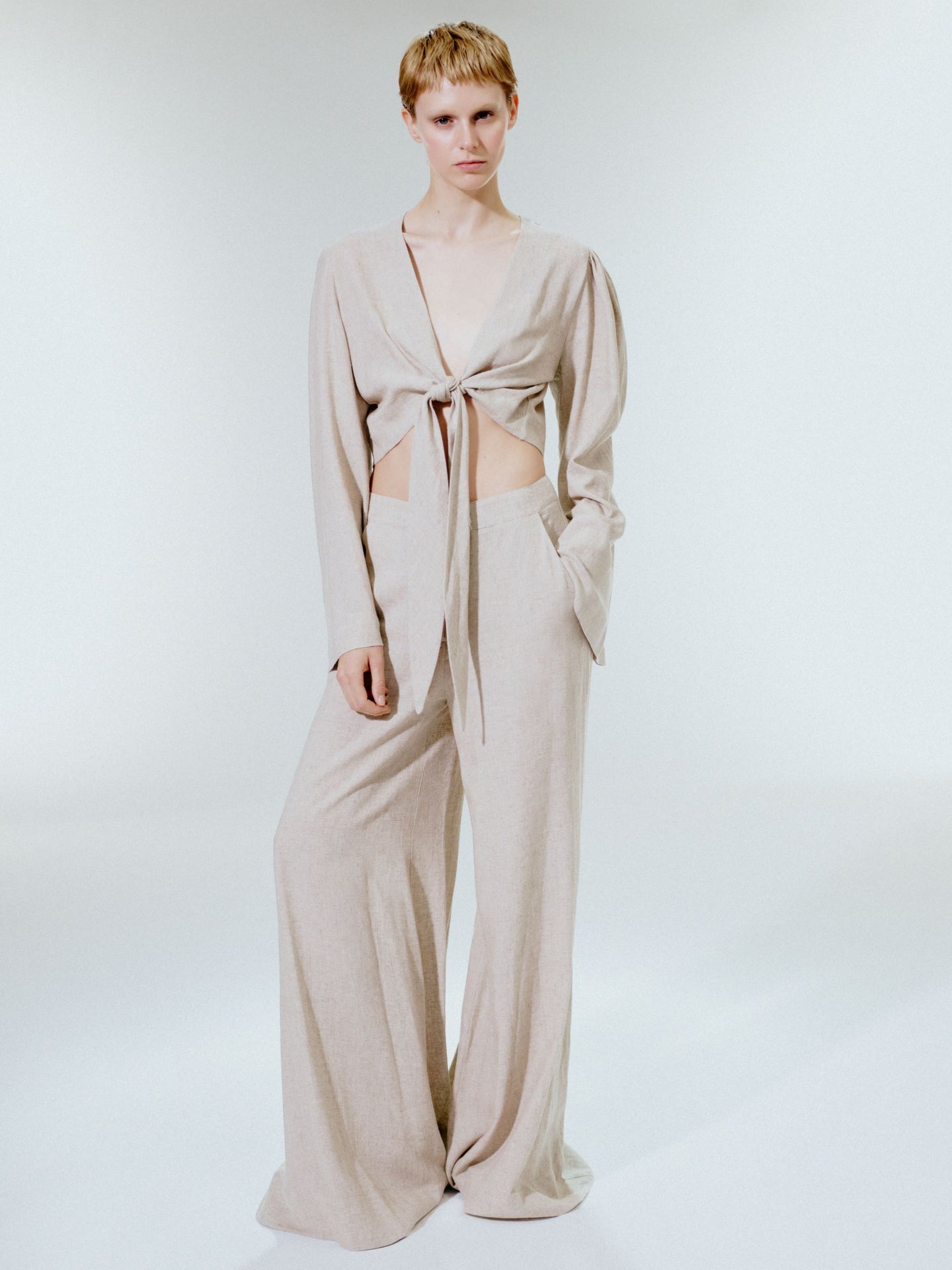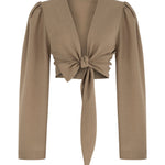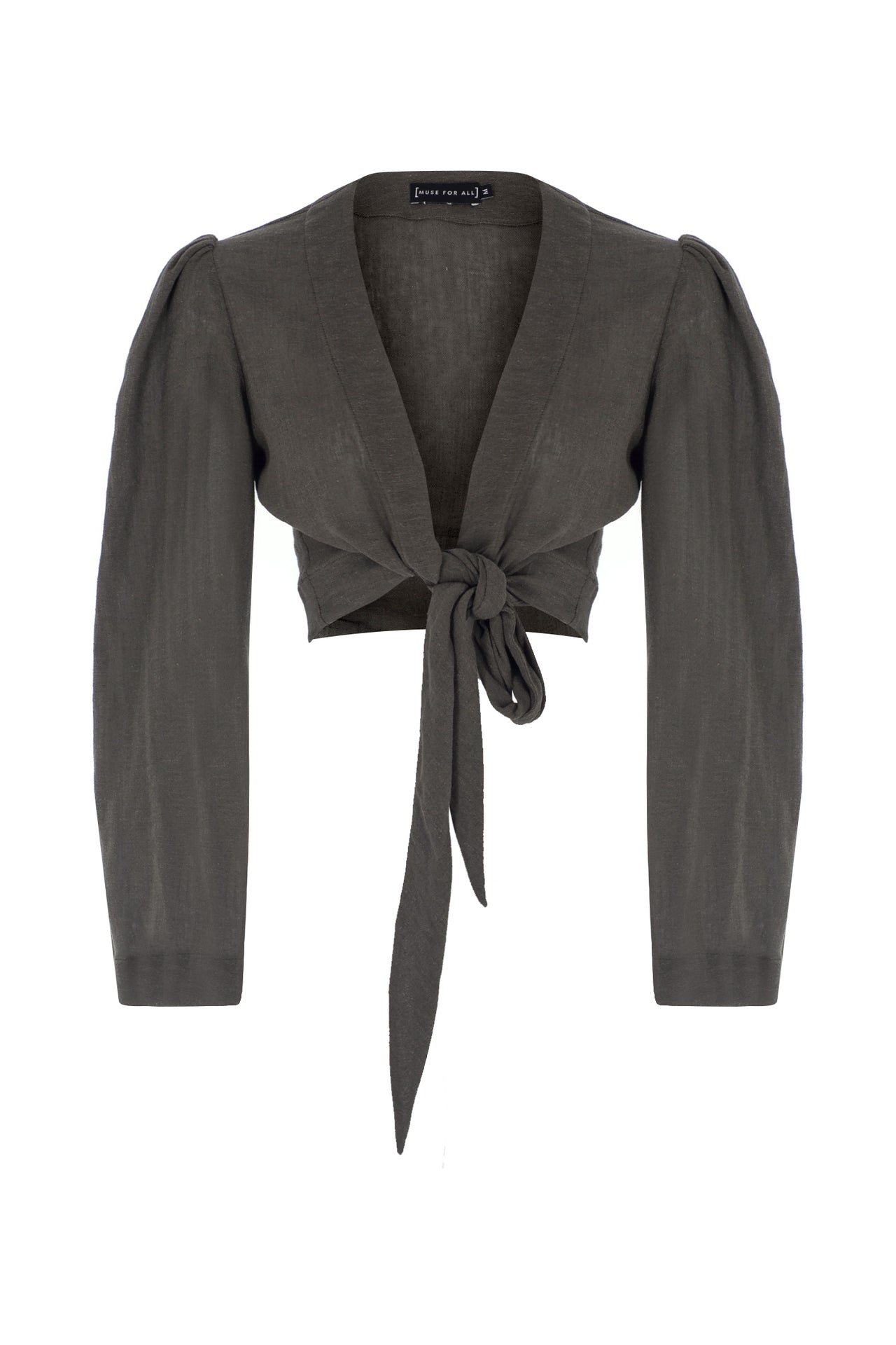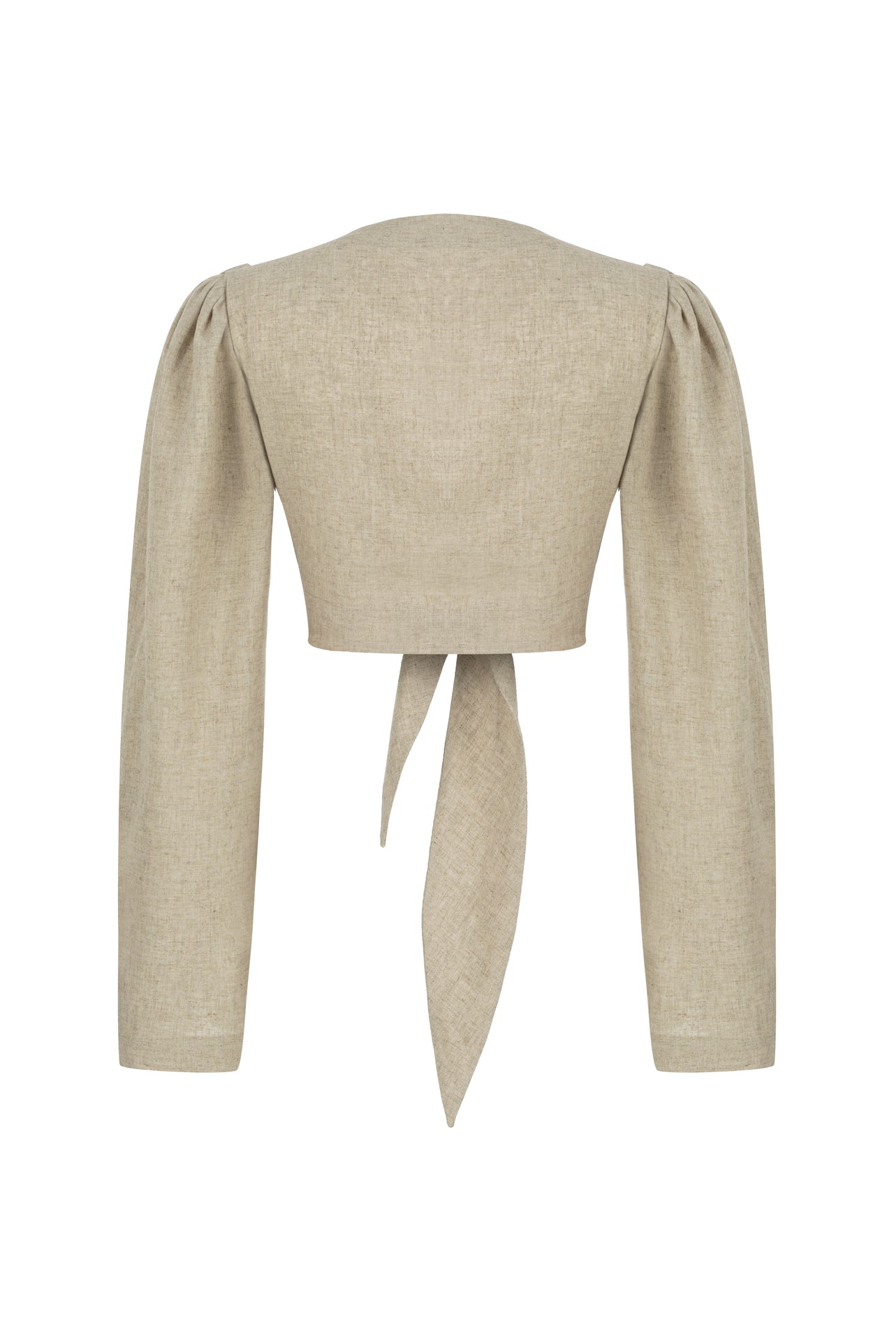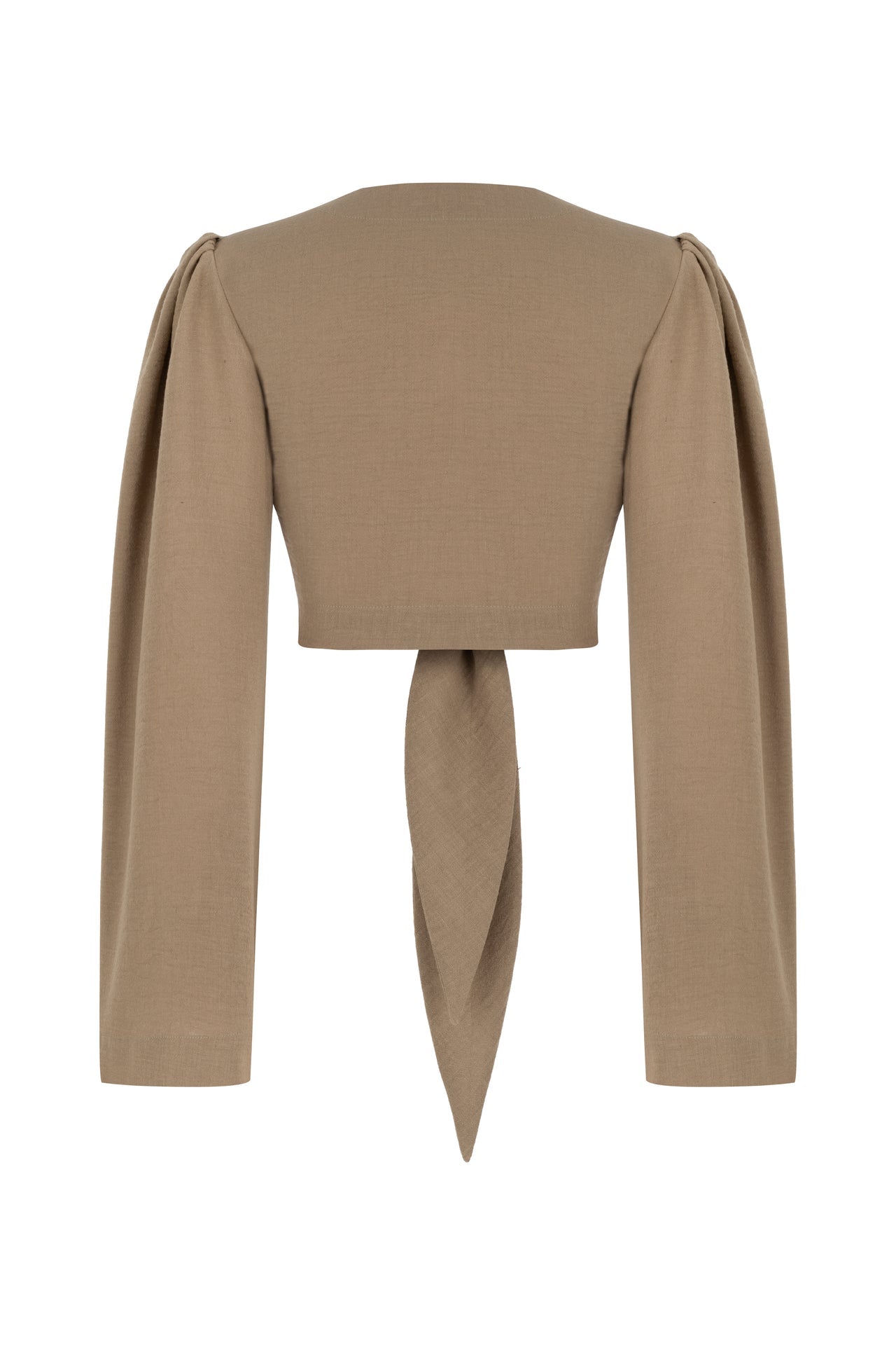 Deep-necked see-through shirt with a bow tie at the front. The sleeves are long Spanish cut. Shoulder tops are shirred. You can complete the look with Lylie Pants.