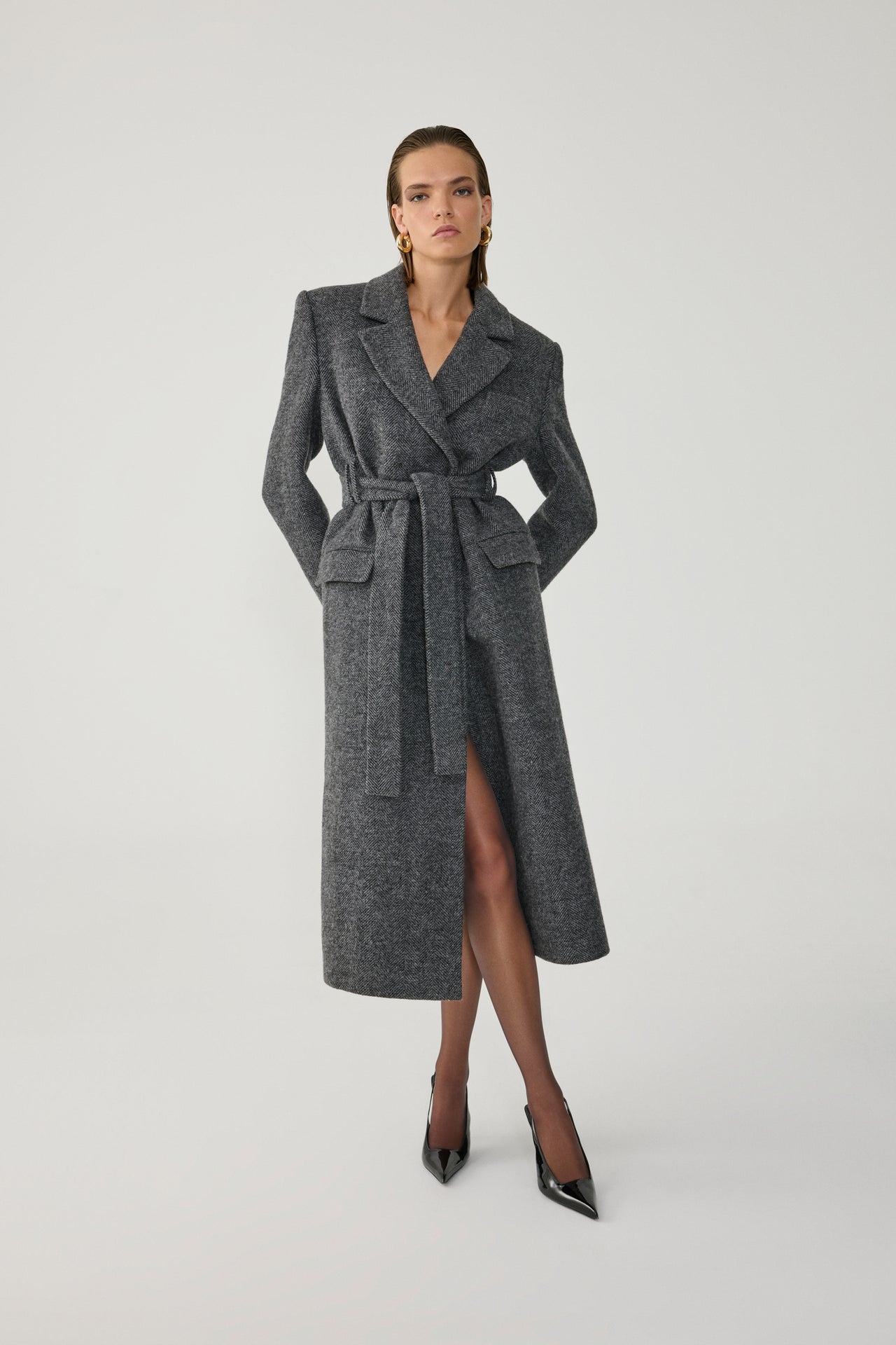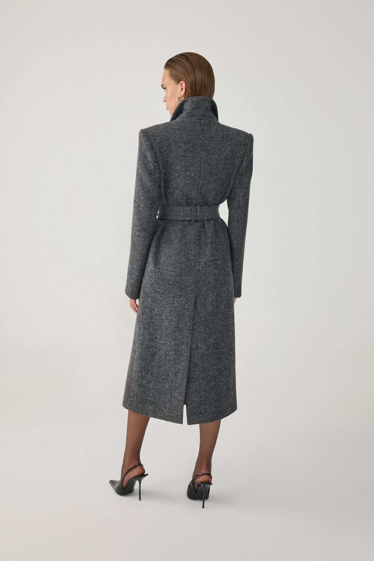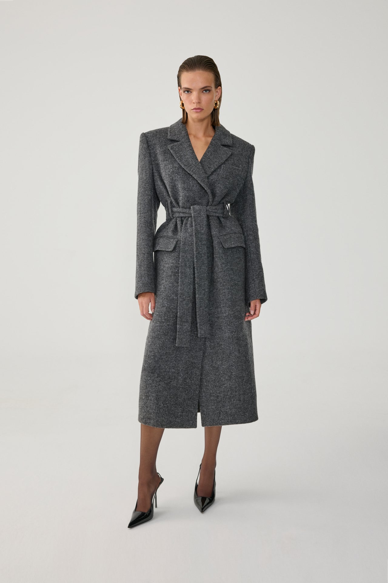 Fitted, belted long coat.