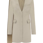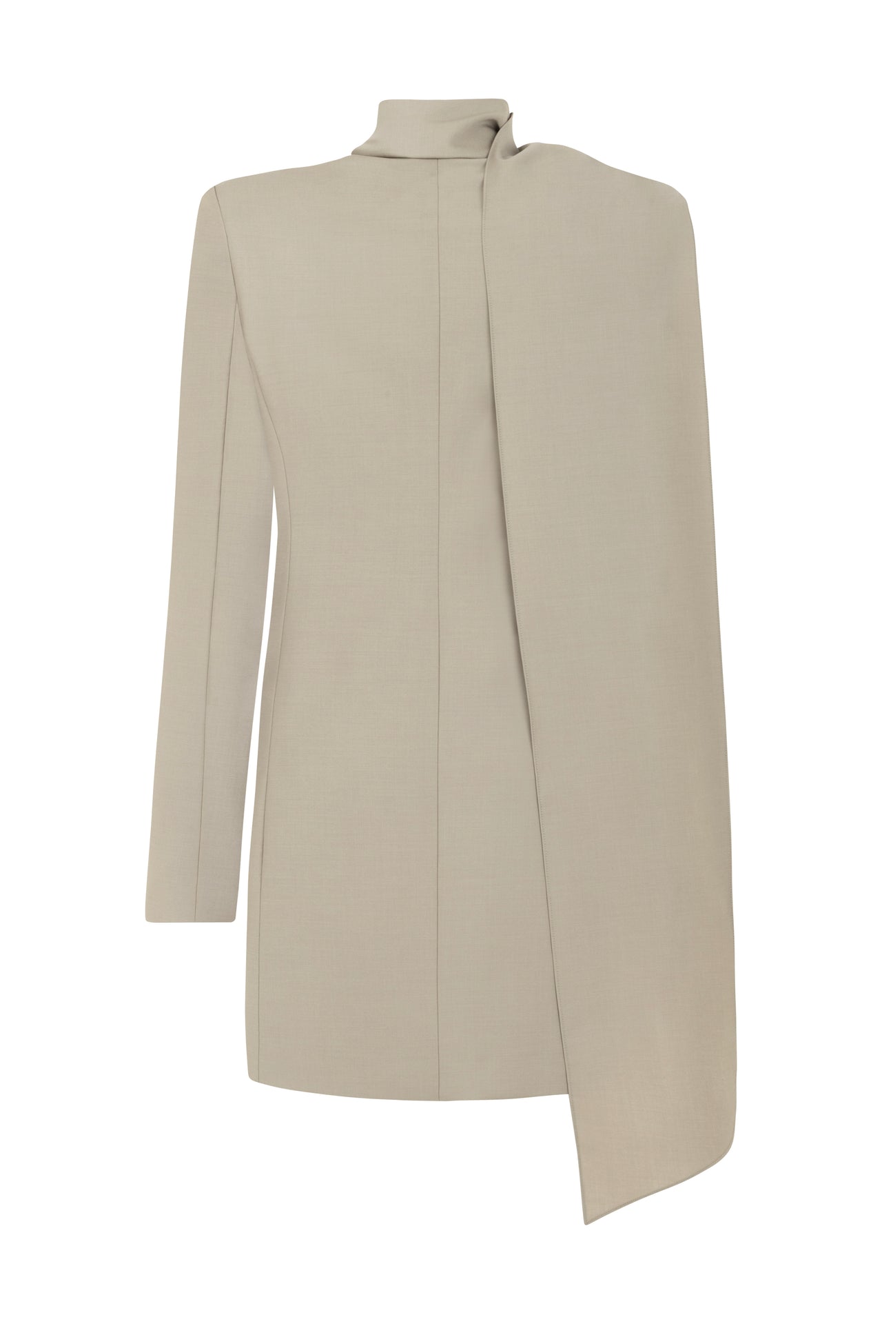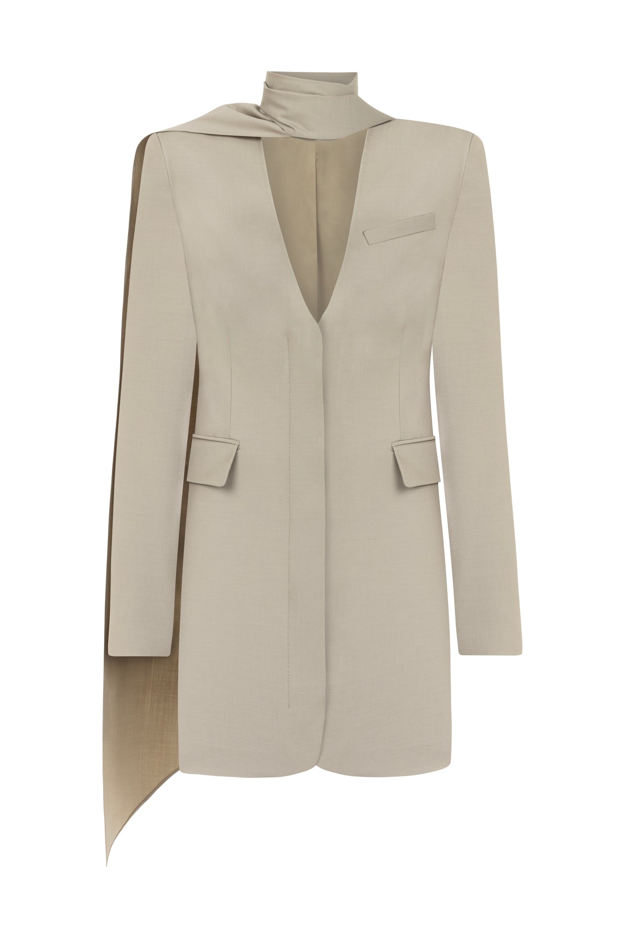 Scarf-detailed long-sleeve mini blazer dress.