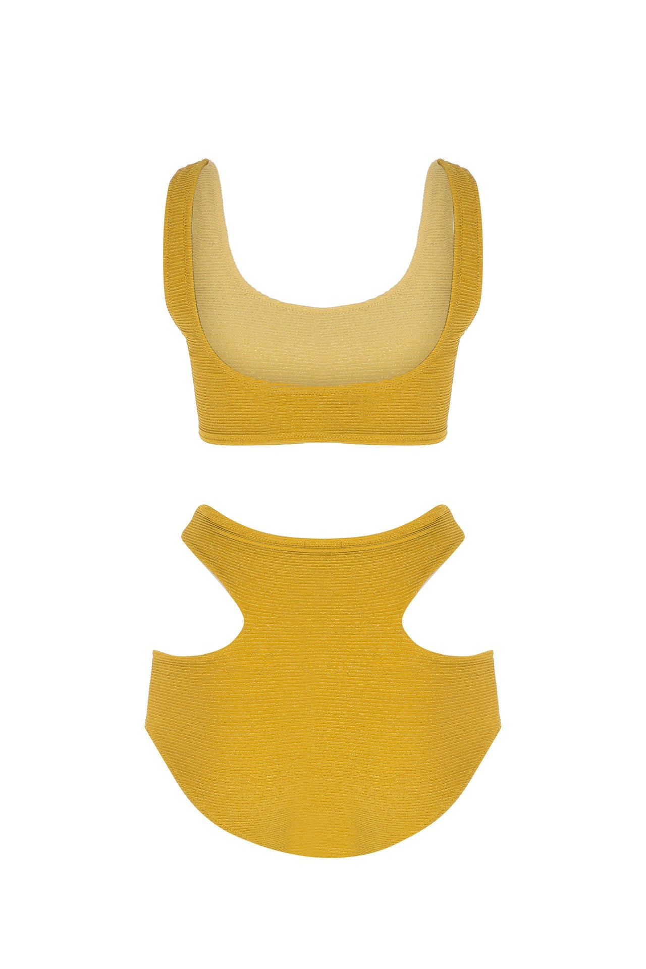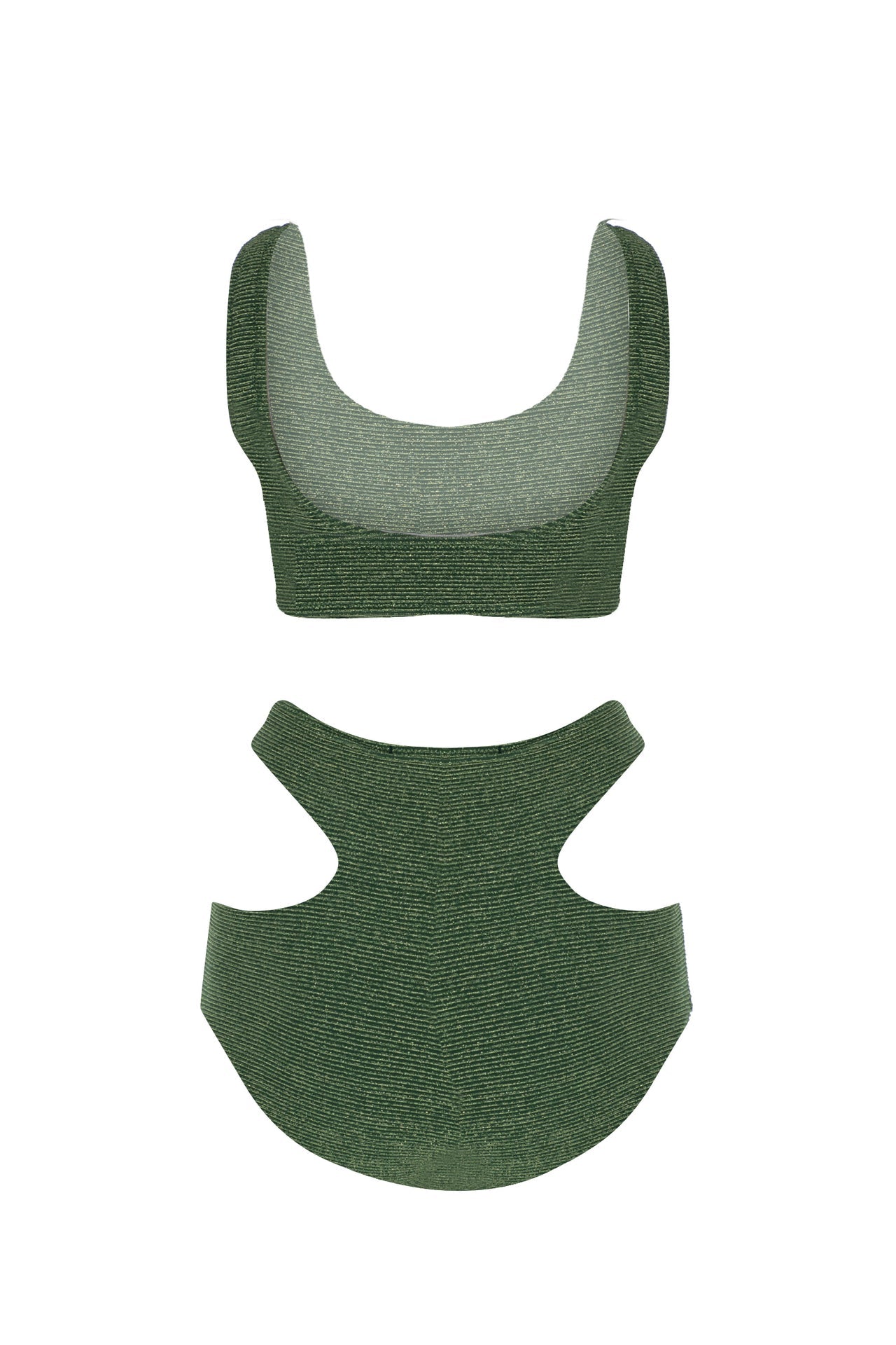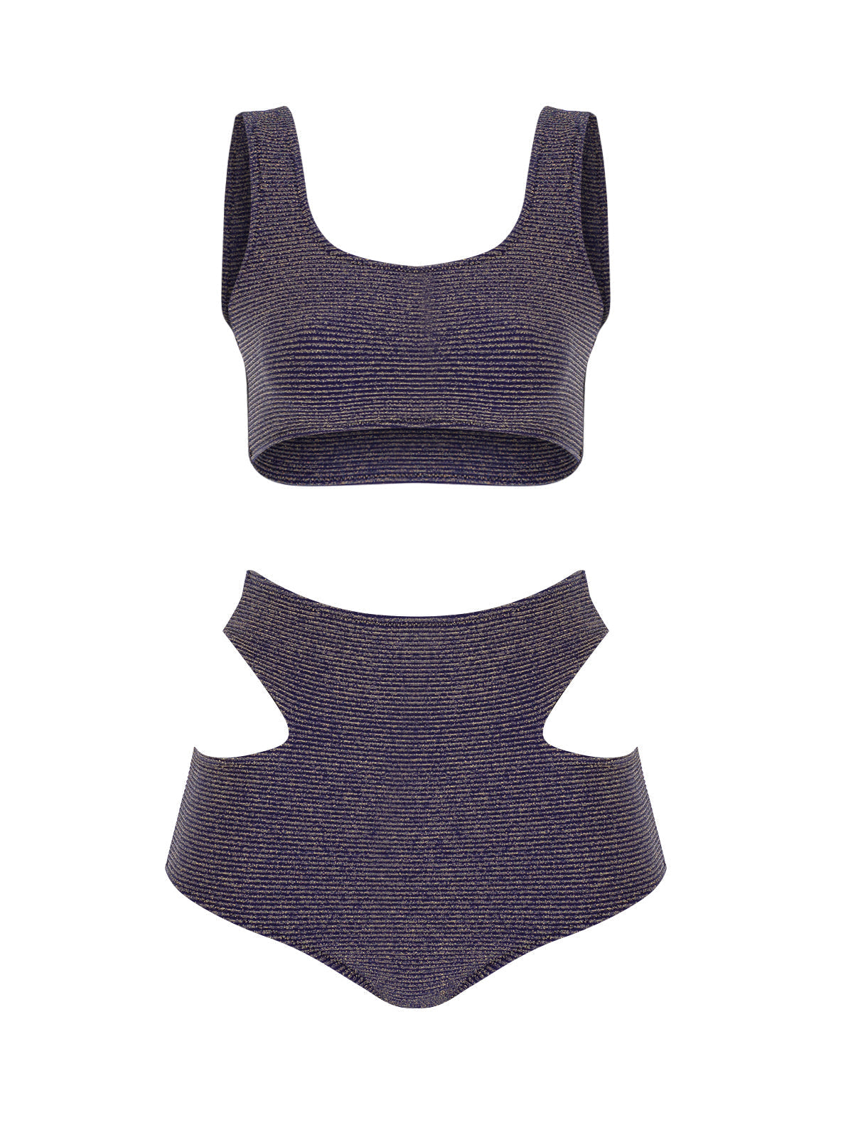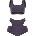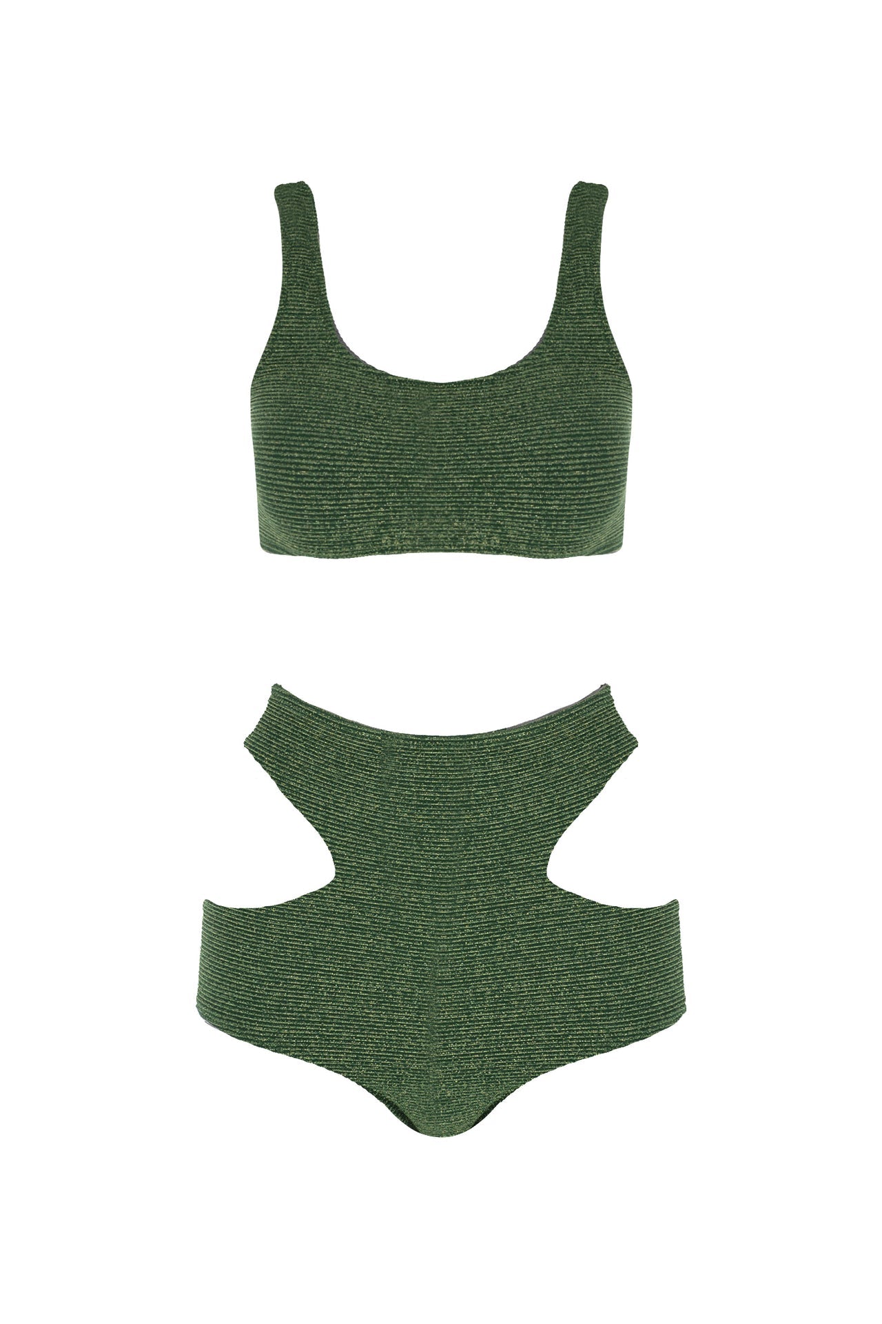 Set consisting of a high waisted bikini bottom with a low-cut on the sides and a bikini top with thick shoulder straps. It has a stretch bodice fabric that hugs the body.