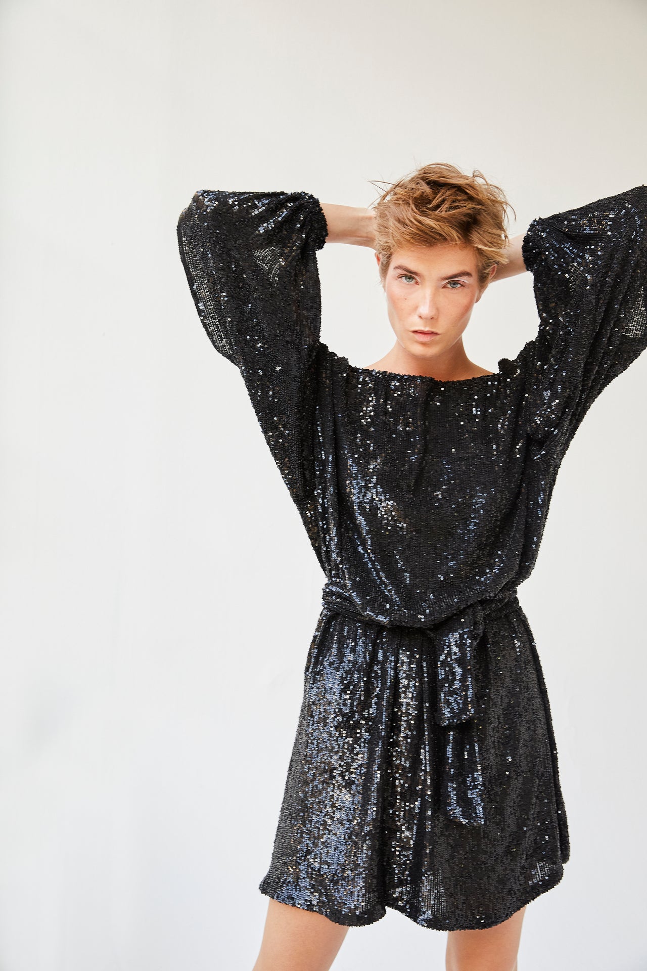 The fabric of the product is silk sequin.