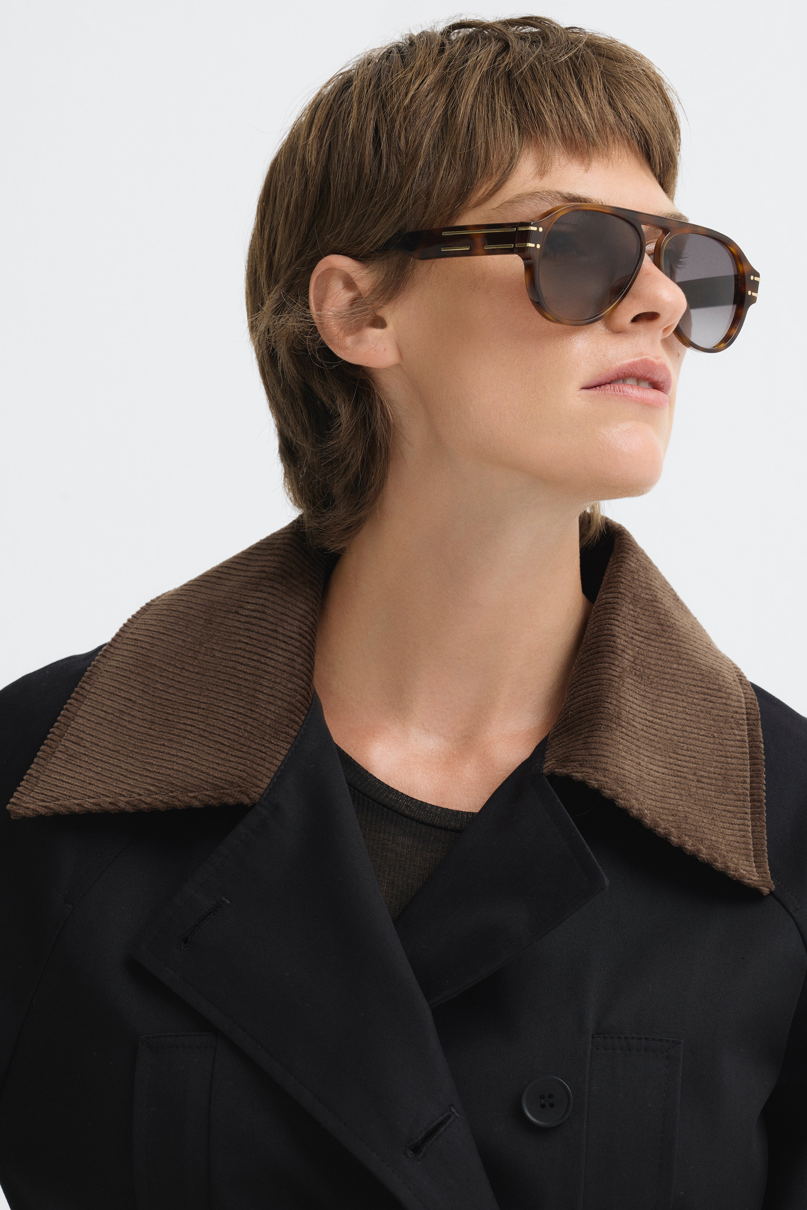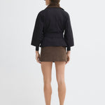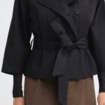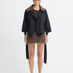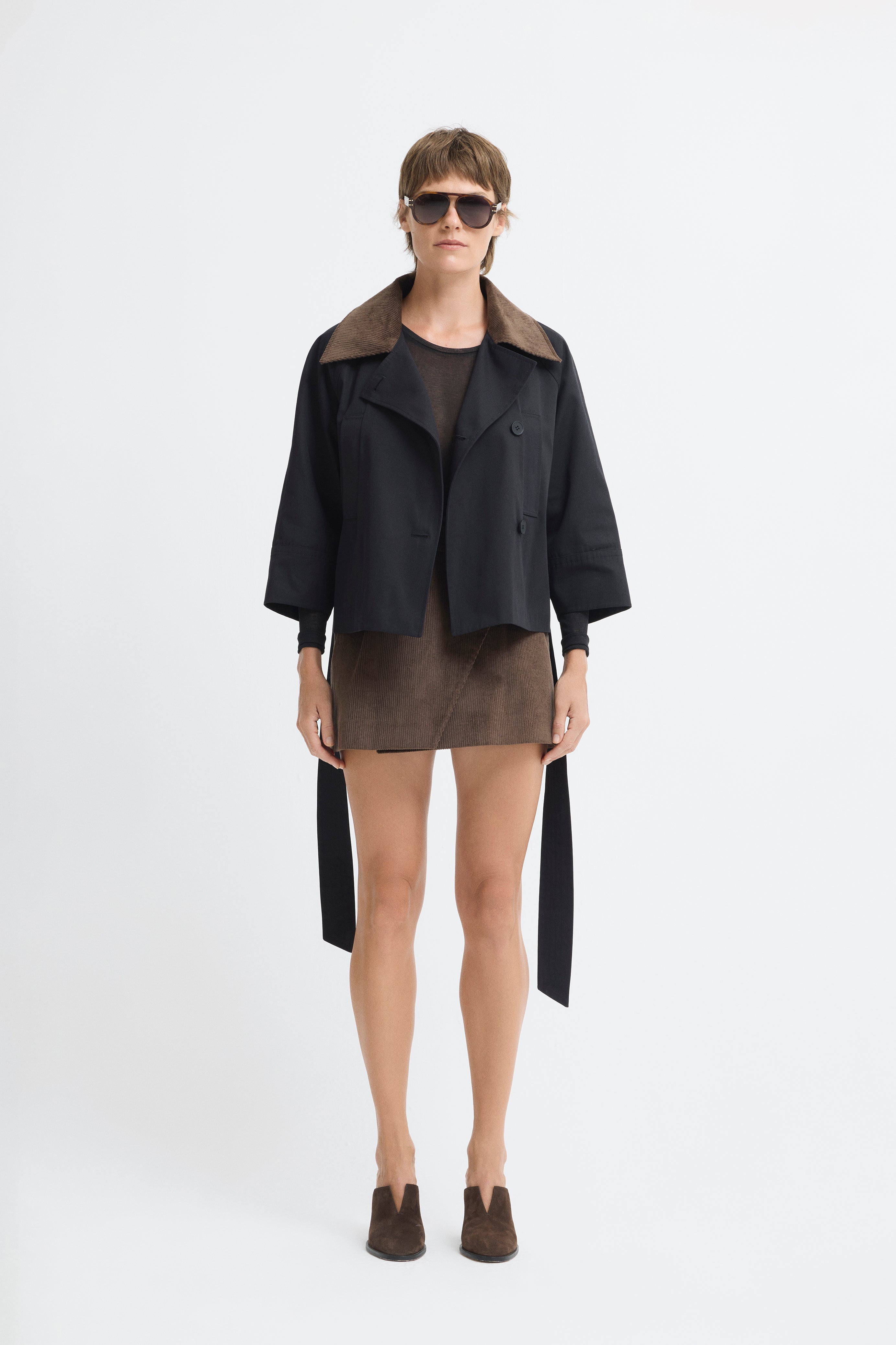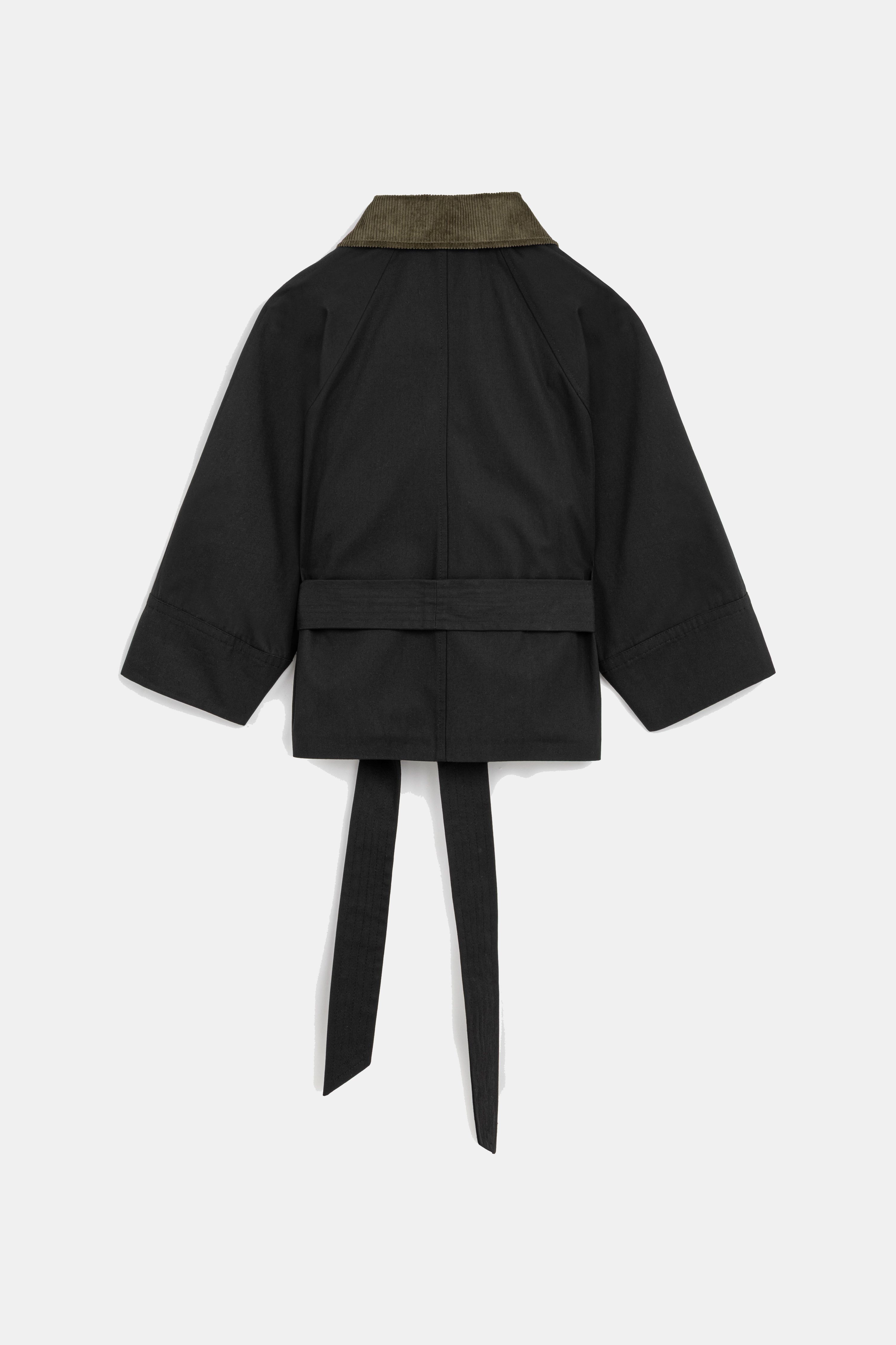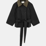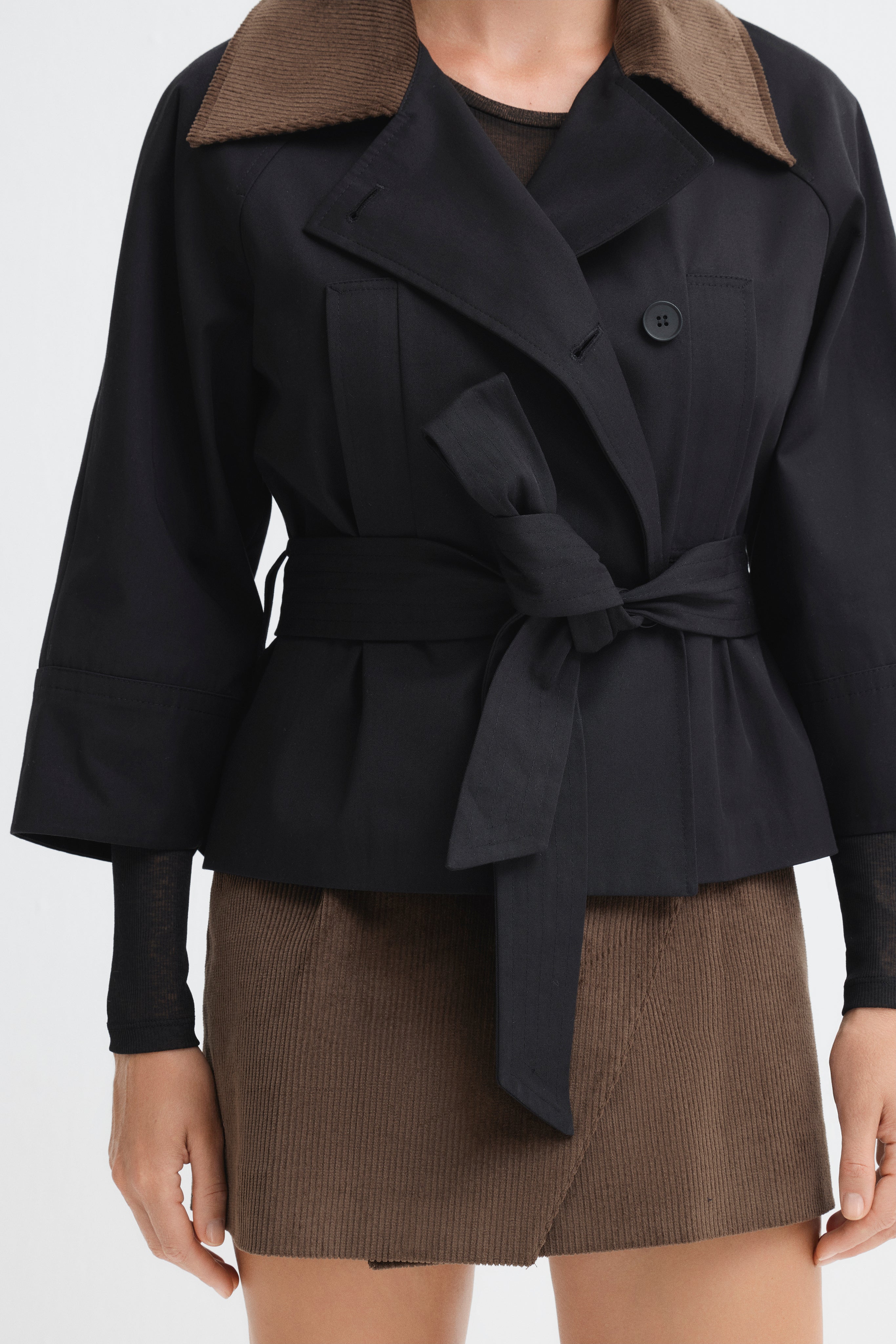 Short trench coat with a wide belt, button details, and contrasting corduroy collar.