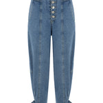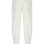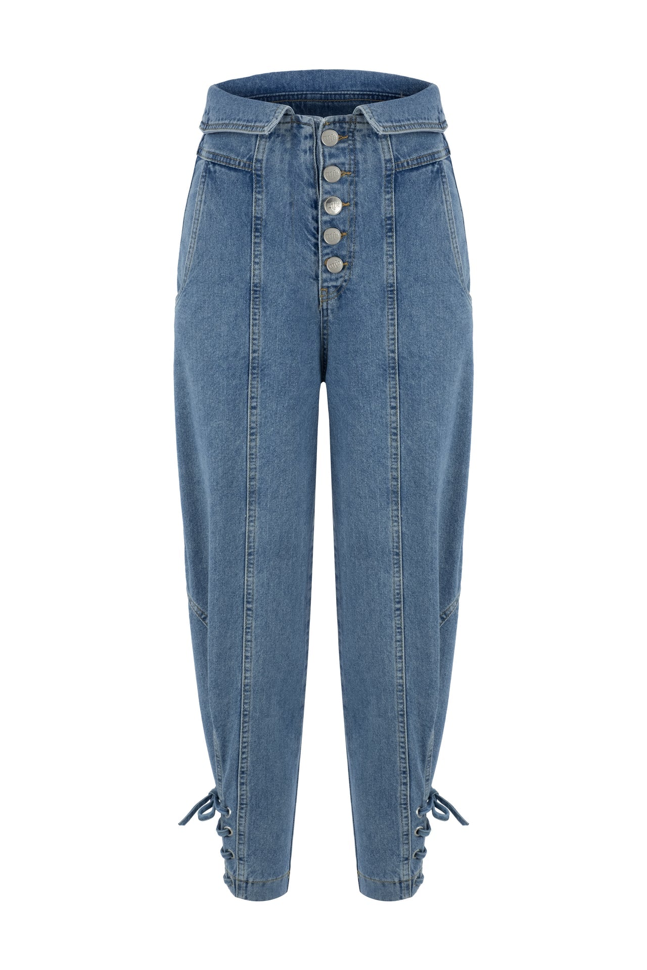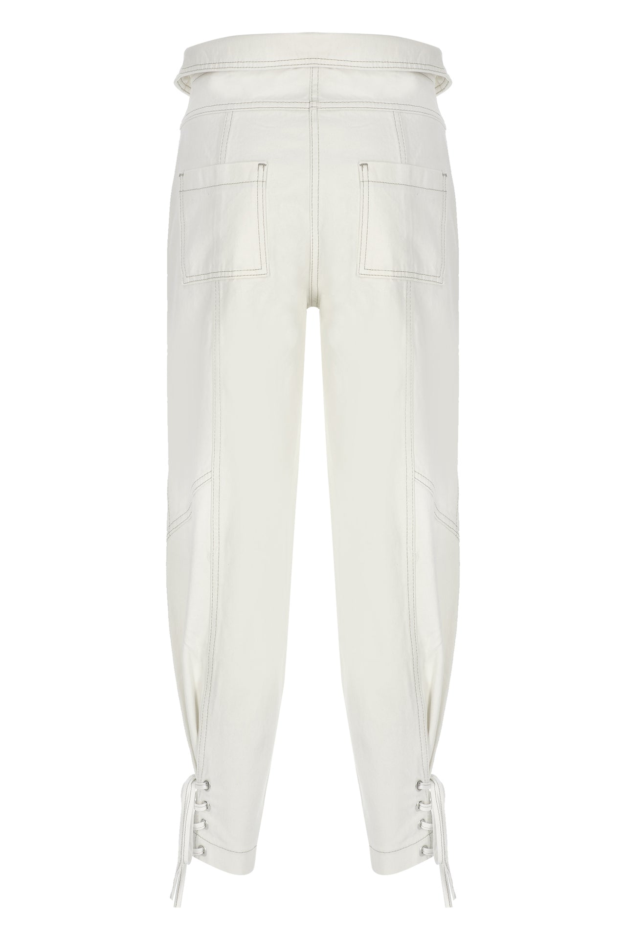 Designer trousers with a high waist that tapers from the hips to the hems. There is a rope on the legs of the trousers with a belt fold detail on the waist.