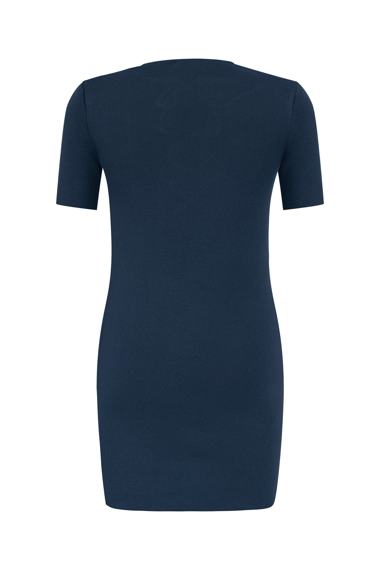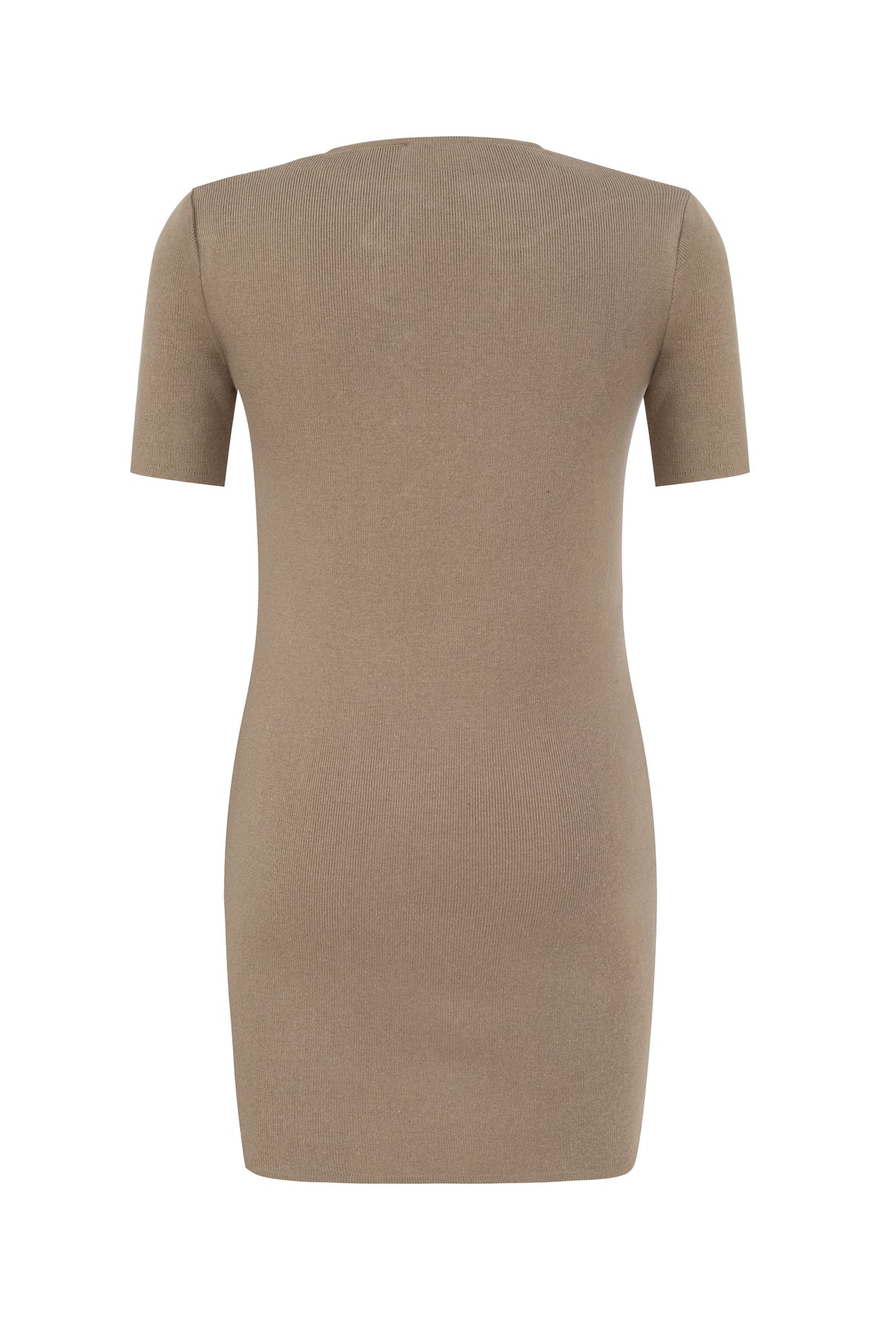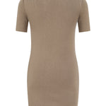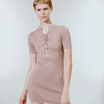 Organic cotton short sleeve mini dress. The dress has a deep neckline in the front. The décolleté is tied with crisscross strings. The dress has a body-hugging design.
