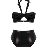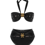 A halterneck bikini set with a gold clasp at the front. Made of stretch bodice fabric, the suit has a body-hugging design.