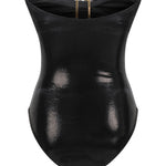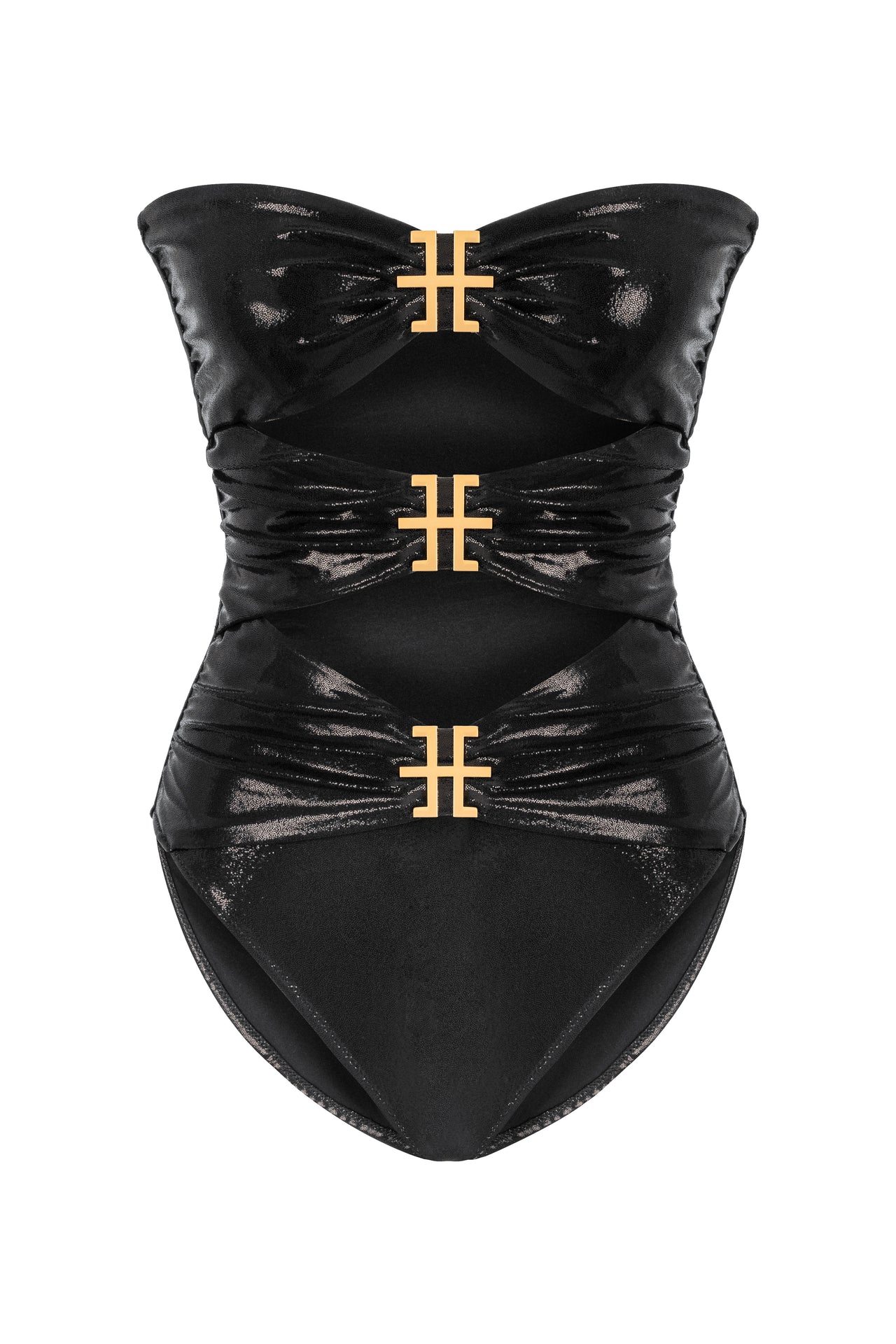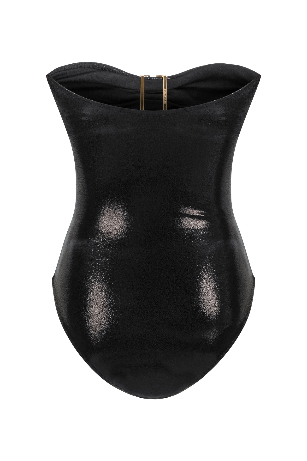 Strapless swimsuit with gold fastening on the front. Made of stretch bodice fabric, the swimsuit has a body-hugging design.